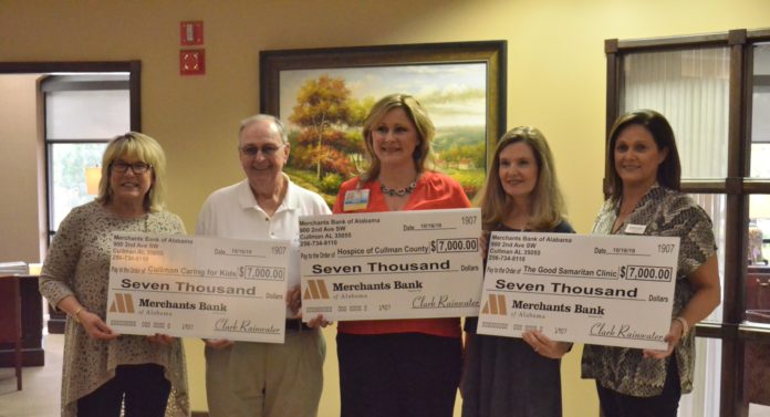 CULLMAN, Ala. – Merchants Bank held its 26th annual Charity Classic golf tournament in September and on Wednesday, several local organizations were at Merchants Bank to receive the proceeds from this year’s event. Cullman Caring for Kids, Good Samaritan Health Clinic and Cullman Regional Home Health and Hospice each received a $7,000 check from this year’s tournament and Merchants Bank’s Ross West was happy to see those organizations benefit from this event again.