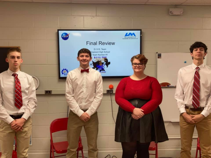 VINEMONT, Ala. – A team from Vinemont High School swept a recent InSPIRESS (Innovative System Project for the Increased Recruitment of Emerging STEM Students) competition in a program sponsored by the University of Alabama at Huntsville (UAH) and NASA. Under the leadership of Vinemont science teacher Shannon Bridges, Project Manager Austin Riddle, Lead Systems Engineer Madison Watson, Chief Engineer Caleb Sharpe and Outreach Leader Sam Maldonado took first-place honors in Payload Concept Proposal, Outreach, Final Review and the overall division title.