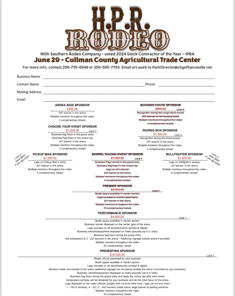 Hanceville Park and Rec currently has sponsorship openings for the upcoming H.P.R Pro Rodeo. Sponsorship packages offer a unique opportunity for businesses to engage with a diverse and passionate audience. Benefits of sponsorship include increased brand visibility through event signage, announcements and social media promotion.