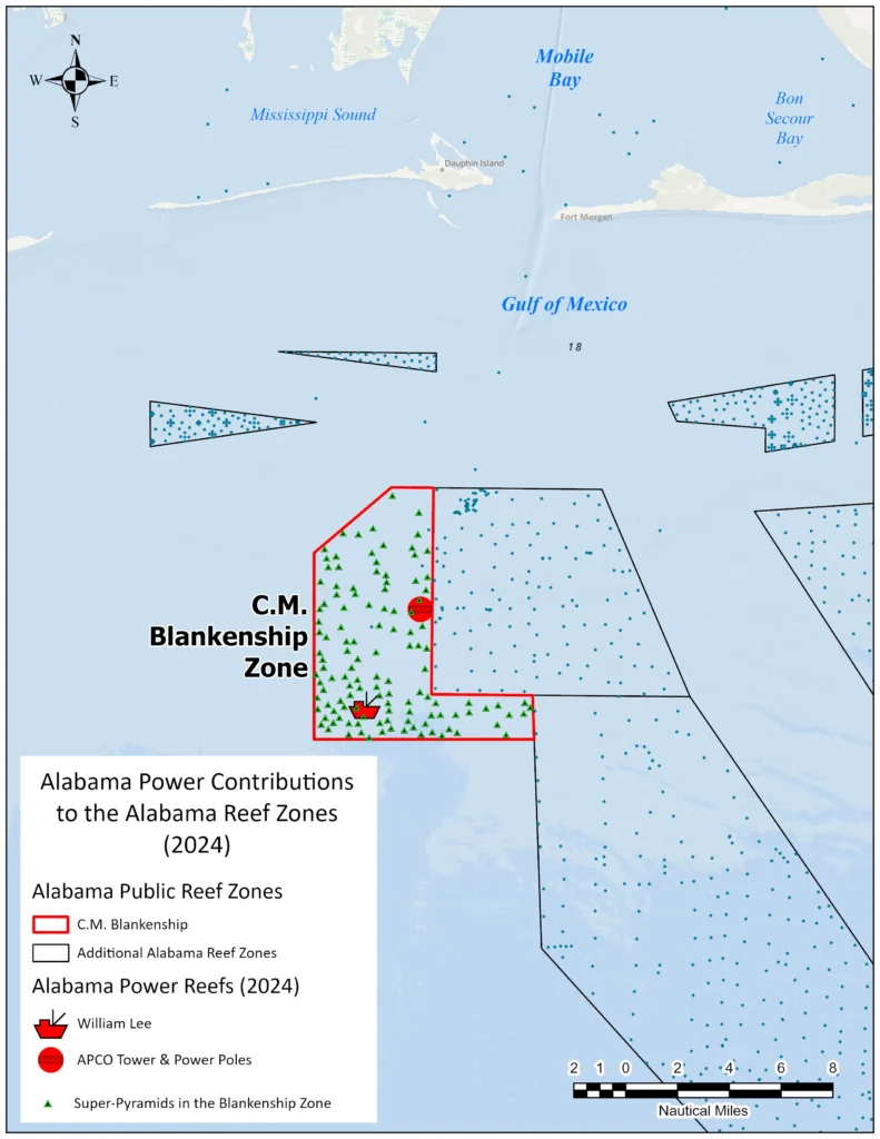 Alabama Power Company recently teamed up with the Alabama Department of Conservation and Natural Resources’ (ADCNR) Marine Resources Division (MRD) to take end-of-life concrete poles and tower segments to build a new reef in the (Conservation Commissioner) Christopher M. Blankenship Reef Zone that covers 65 miles of Gulf of Mexico bottom between 10 and 20 miles off the Alabama coast.