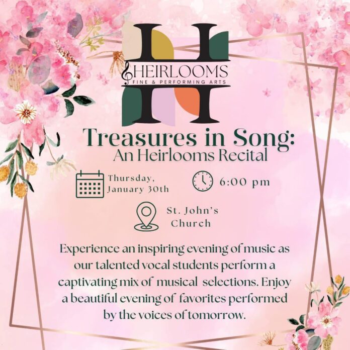 CULLMAN, Ala. – Heirlooms Fine & Performing Arts is set to present “Treasures in Song: An Heirlooms Recital” on Thursday, Jan. 30, at 6 p.m. at St. John’s Church. Tickets will be available at the door for $5 per person.
