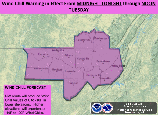 HUNTSVILLE- Rain will change over to snow tonight, with accumulations of 1-2 inches expected EAST of I-65 (for Dekalb, Marshall, and Jackson counties in NE AL, and Franklin County in Southern Middle Tennessee). In addition, gusty northwest winds will produce dangerous wind chills tonight, so a Wind Chill Warning is in effect. Values of 0 to -10F are expected tonight.