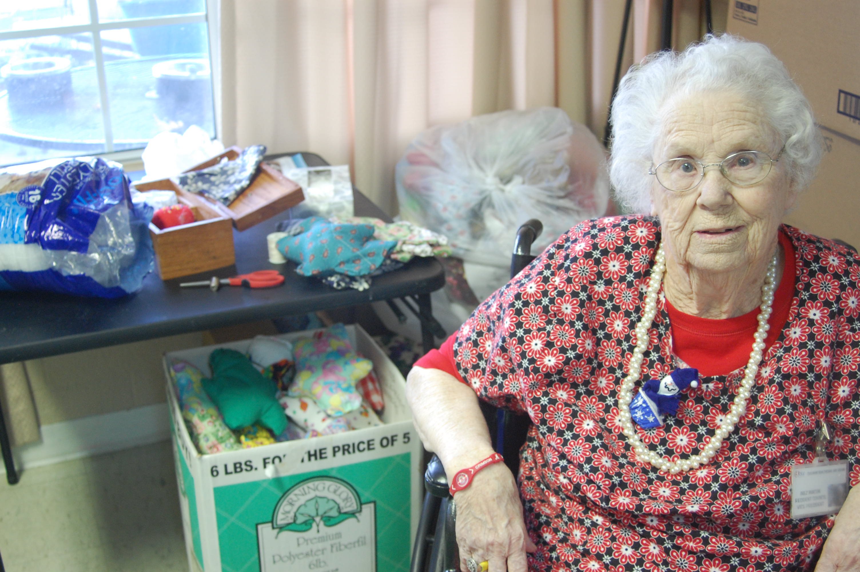 Inez said, “Every day I’m out here. I get out here by daylight. If anybody’s hunting me, they say, ‘Go where she’s sewing at.’” The staff at the nursing home always knows where to look for Inez because she starts sewing in the activity room at about 8:30 in the morning and stays until 11:30 before lunch is served. She comes back after lunch at about 12:30 and stays until about 4 in the afternoon. “I don’t get too tired. I’ve gotten used to it and I just do it all the time.”