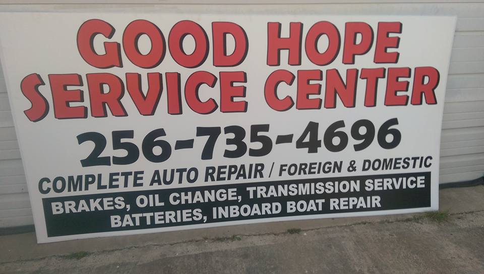 Good Hope Service Center is located at 848 County Road 437. They are open Monday – Saturday from 8 a.m. – 6 p.m. For more information, call 256-735-4696, email servicecentergoodhope@gmail.com or visit them on Facebook at https://www.facebook.com/good.hope.1293.