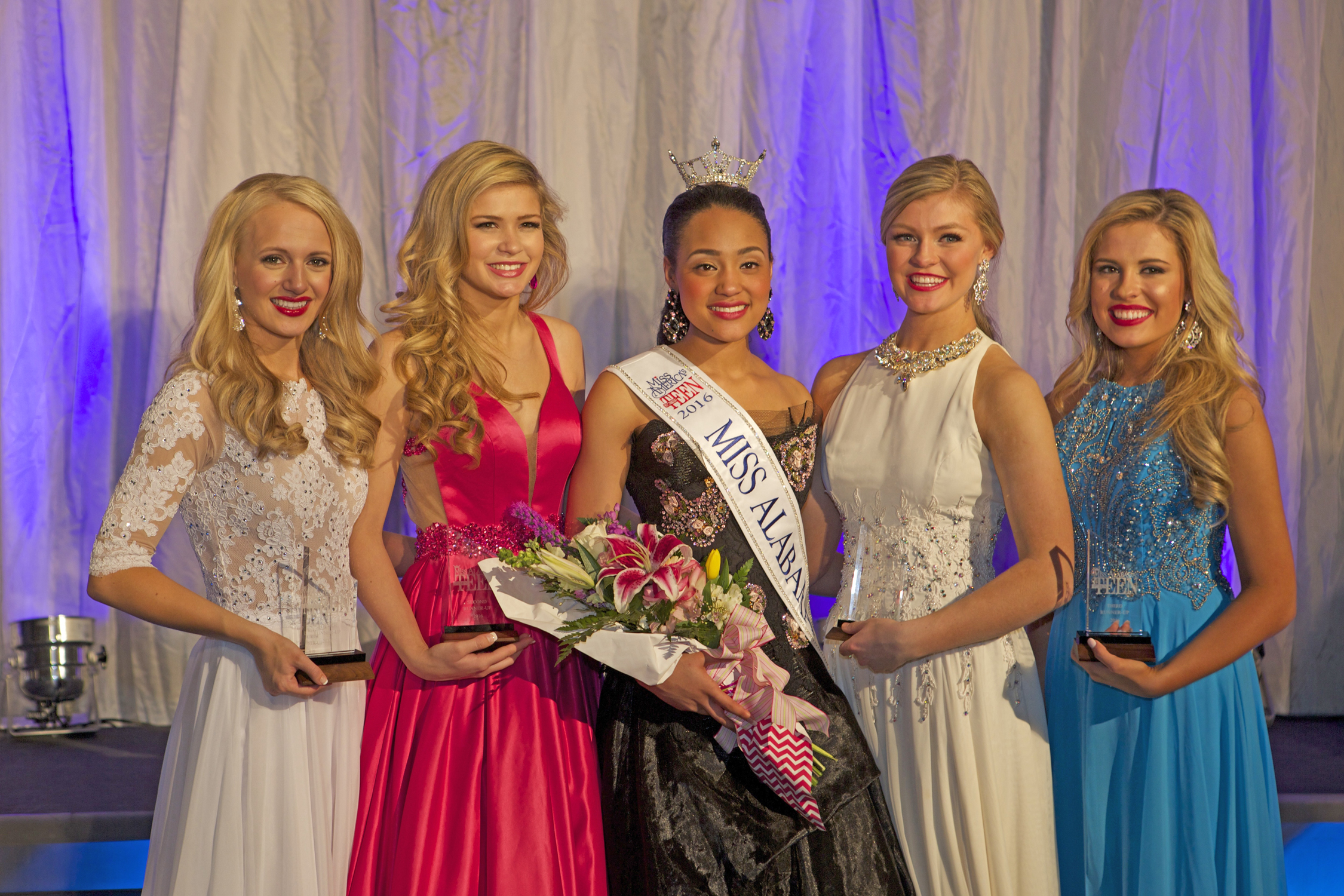 Photo shows Miss Alabama’s Outstanding Teen Top Five. From left, Lindsay Fincher, fourth runner-up; Charity Bowden, second runner-up; Miss Alabama’s Outstanding Teen 2016, Tiara Pennington; Jessica Baeder, first runner-up; and Brooke Edwards, third runner-up.