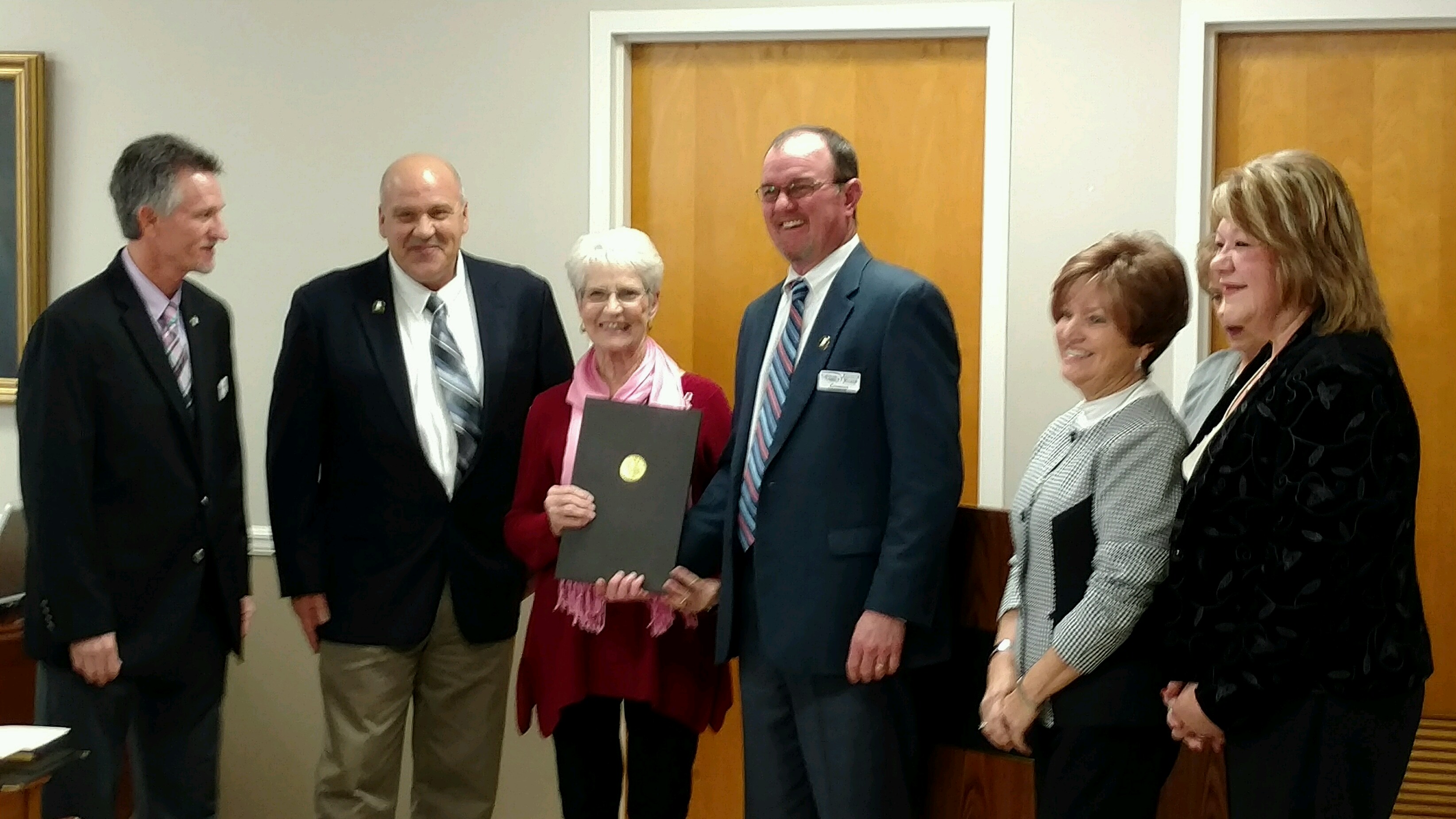 Photo shows Cullman County Bosom Buddies Founder Mary Dyer accepting the proclamation from Commission Chairman Kenneth Walker for Colors of Cancer Day.