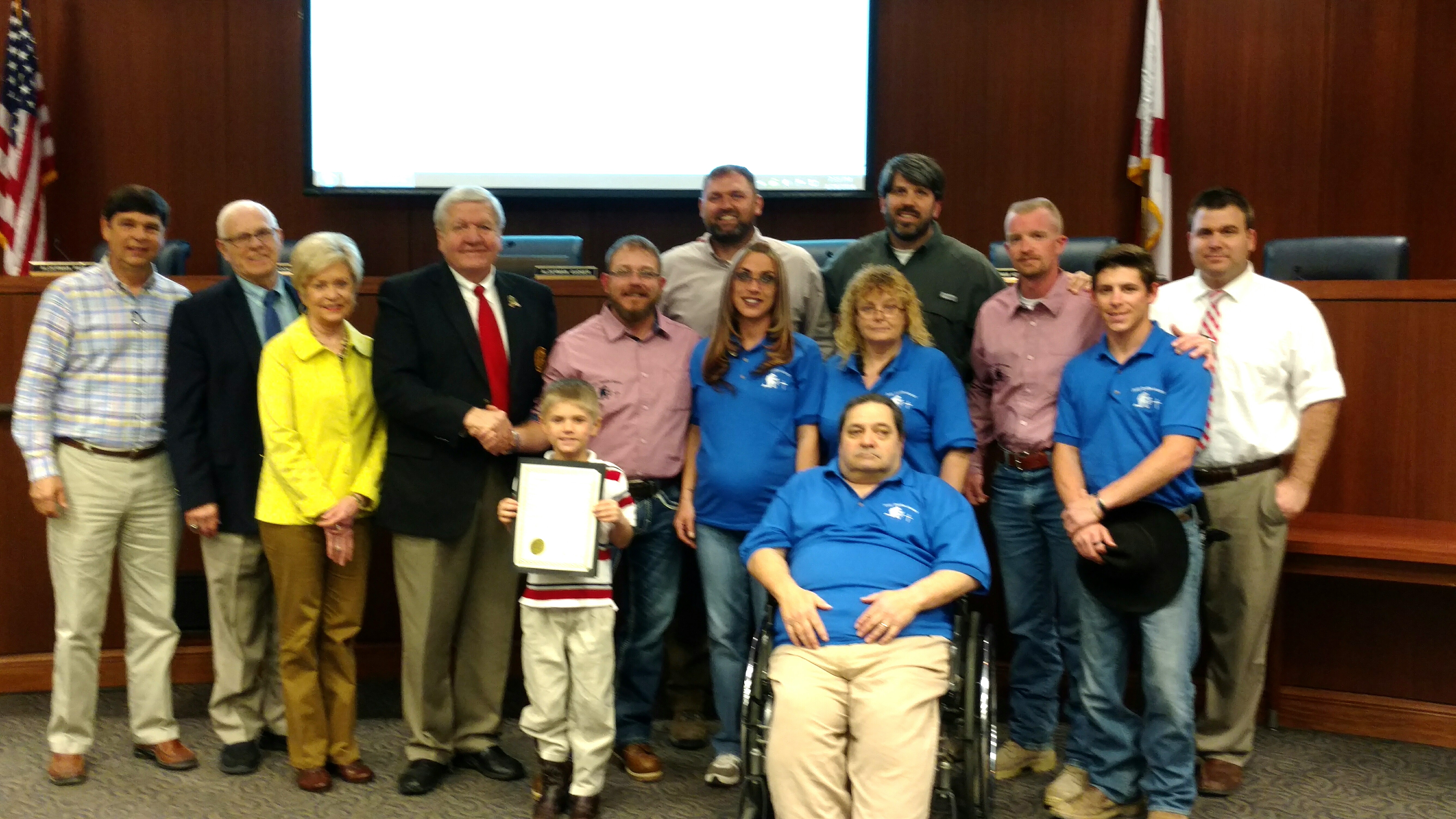 Photos shows Cullman Mayor Max A. Townson and U.S. Marine Sgt. Jeremy Hogan (center) with members of Hogan's nonprofit Saving Forgotten Warriors and the Cullman City Council.