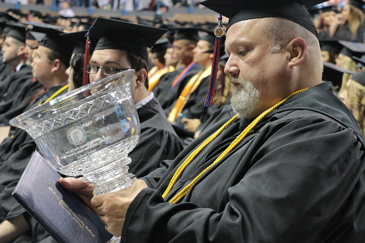 Photo: Jeffrey Johns of Hanceville looks at the Academic Excellence Award trophy he received during the May 13, 2016 commencement ceremony at Tom Drake Coliseum.