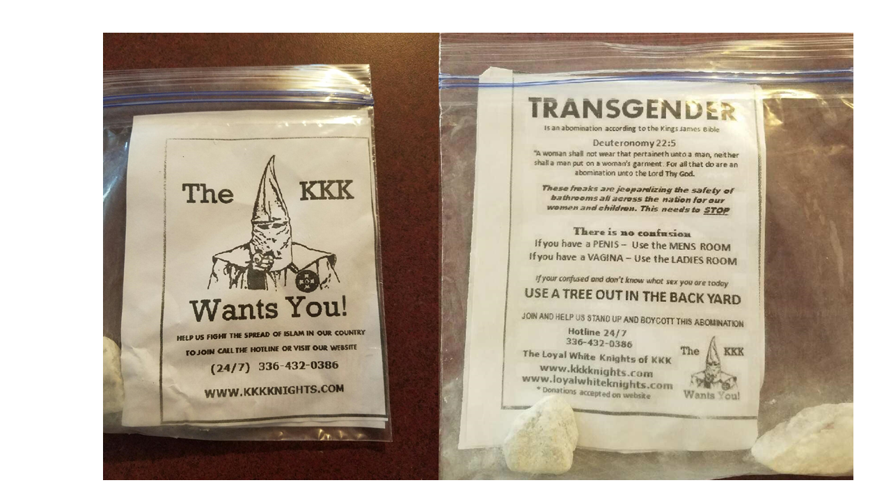 The most recent propaganda, which was littered all along his street (Goldridge Road), boldly has, among other things, “transgender is an abomination according to the King James Bible,” written on it. According to Hays, the packet also beckons people to “help us fight the spread of Islam in our country.”