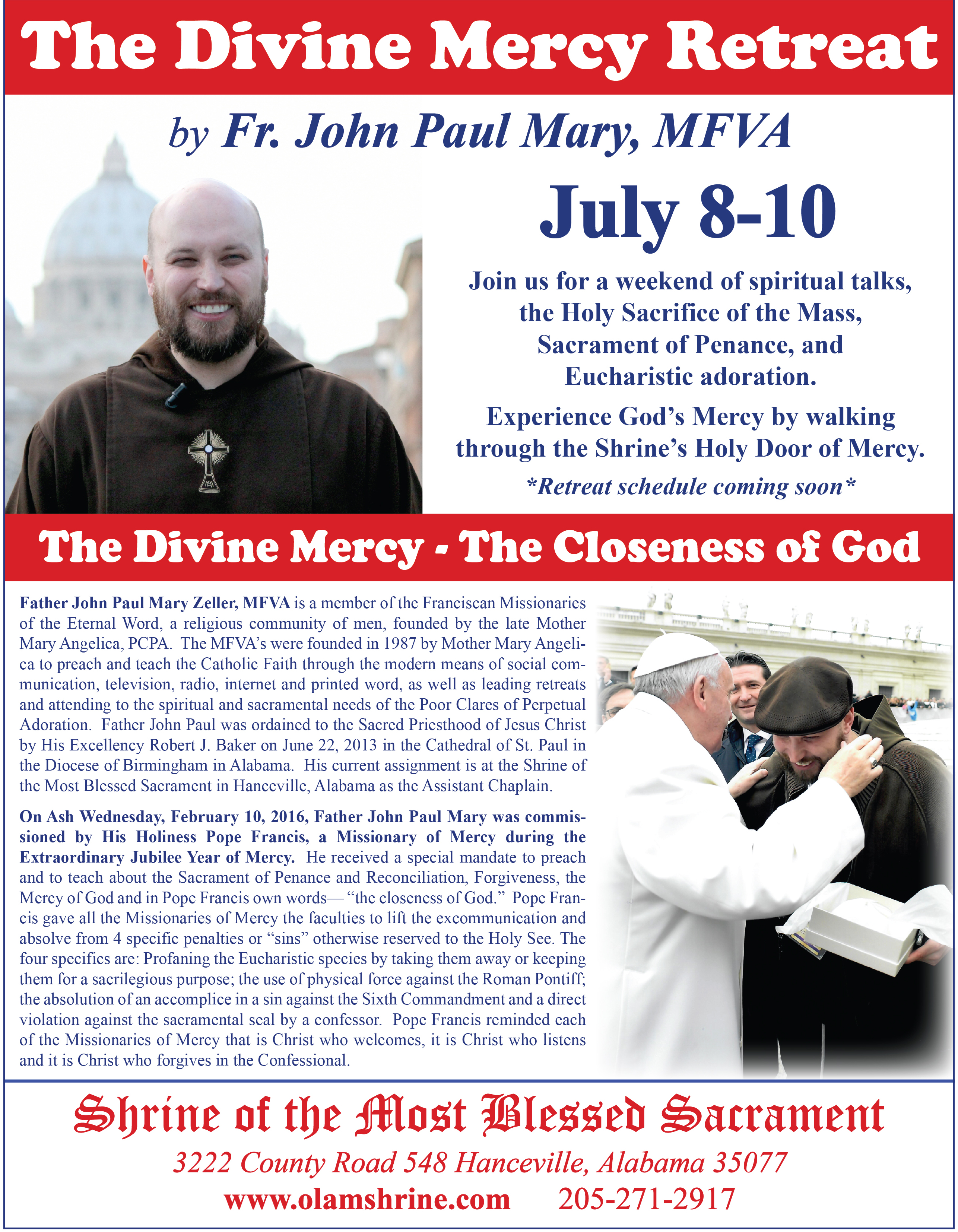 HANCEVILLE – Everyone is invited to The Divine Mercy Retreat – The Closeness of God given by Father John Paul Mary Zeller, MFVA. The retreat will take place the weekend of July 8-10 at The Shrine of the Most Blessed Sacrament in Hanceville.