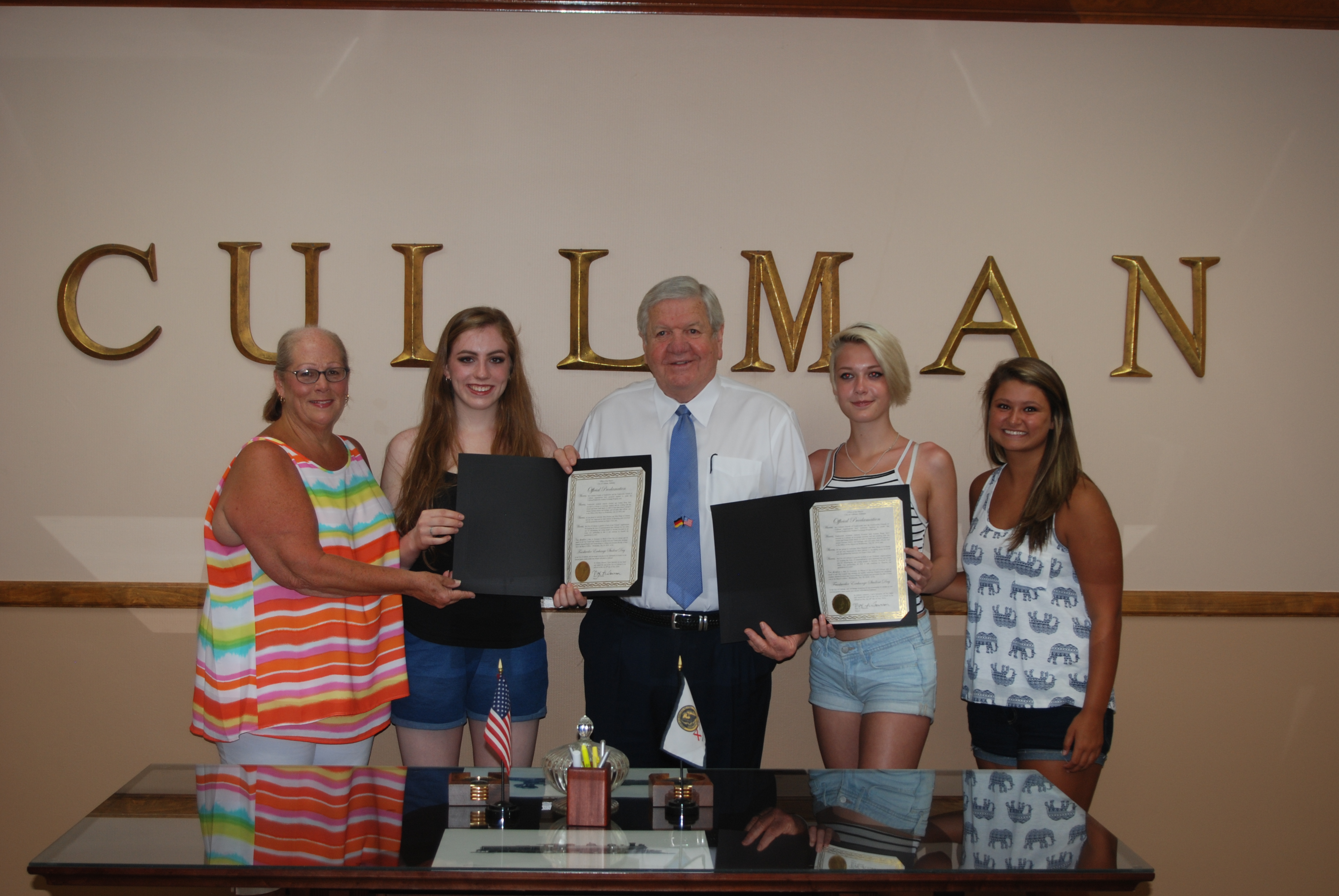 Now, therefore, I, Max A. Townson, as Mayor of the City of Cullman and on behalf of our City Council and citizens, do hereby welcome Frankweiler exchange students Antonia Poulsen and Verena Rong to Cullman and proclaim the day of their visit to the Mayor’s Office – Wednesday, July 20, 2016 – to be FRANKWEILER EXCHANGE STUDENT DAY in the City of Cullman, and encourage everyone in our community to tender to our honored guests a most cordial and sincere welcome to Cullman!