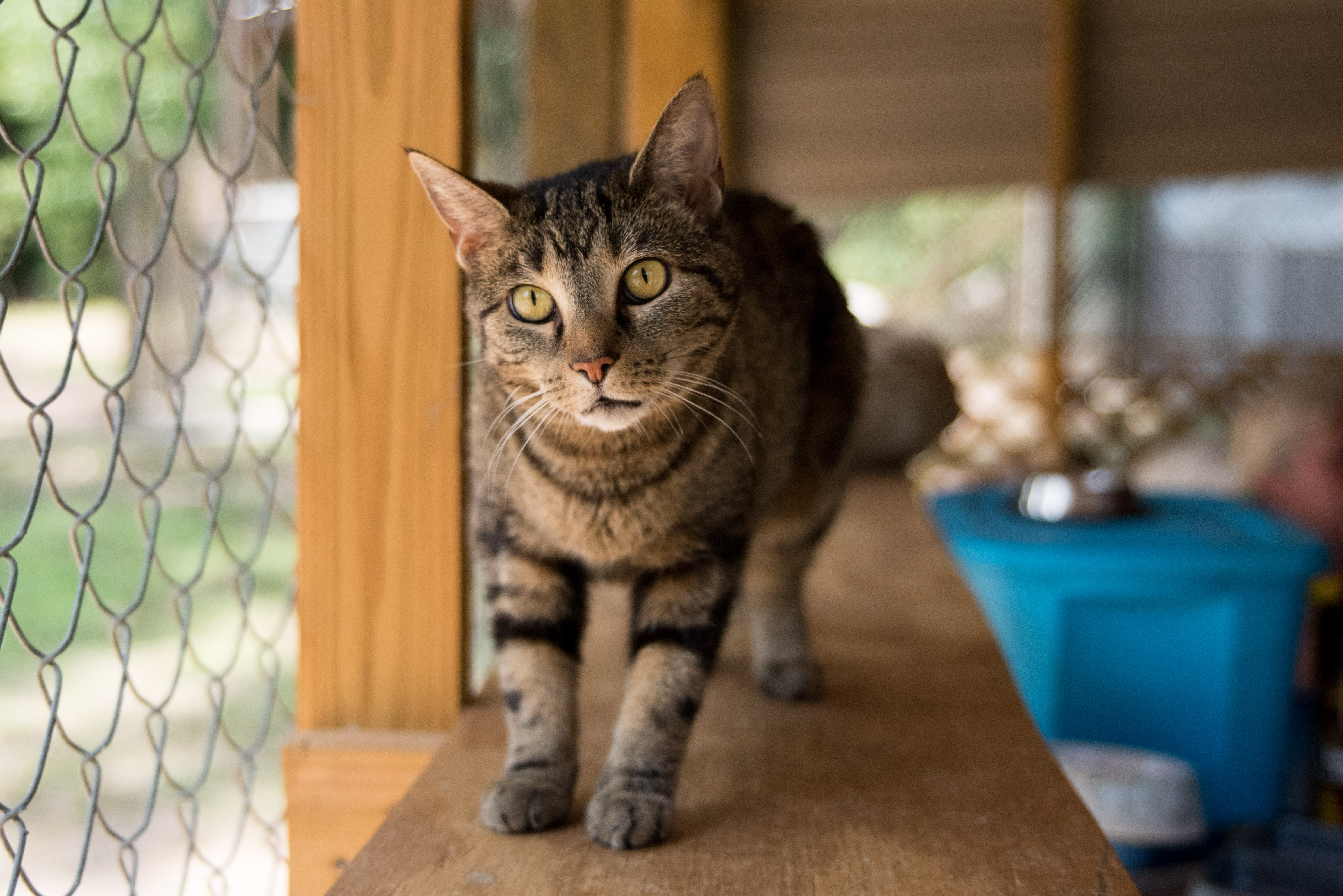 The cat facility, dubbed "cattery," houses nearly 15 cats awaiting adoption at the sanctuary. An enclosed room with furniture and fans adjoins a patio area called a "catio," creating a secure, versatile environment for the animals.