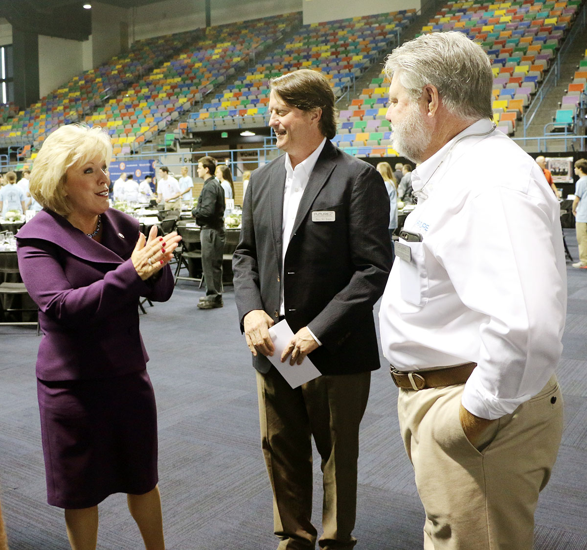 From left, Wallace State President Dr. Vicki Karolewics shares a conversation with Bill St. John and Scotty Hooper during Wednesday’s Student Investment Luncheon and Auction. Image credit: WSCC