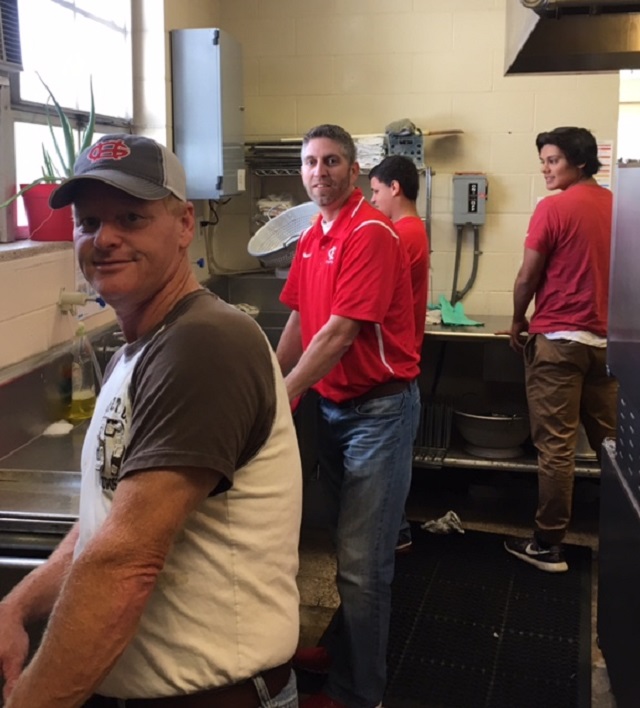 Councilman Taft Dillashaw, Coach Alan Scott and members of the GHHS football team wash dishes.
