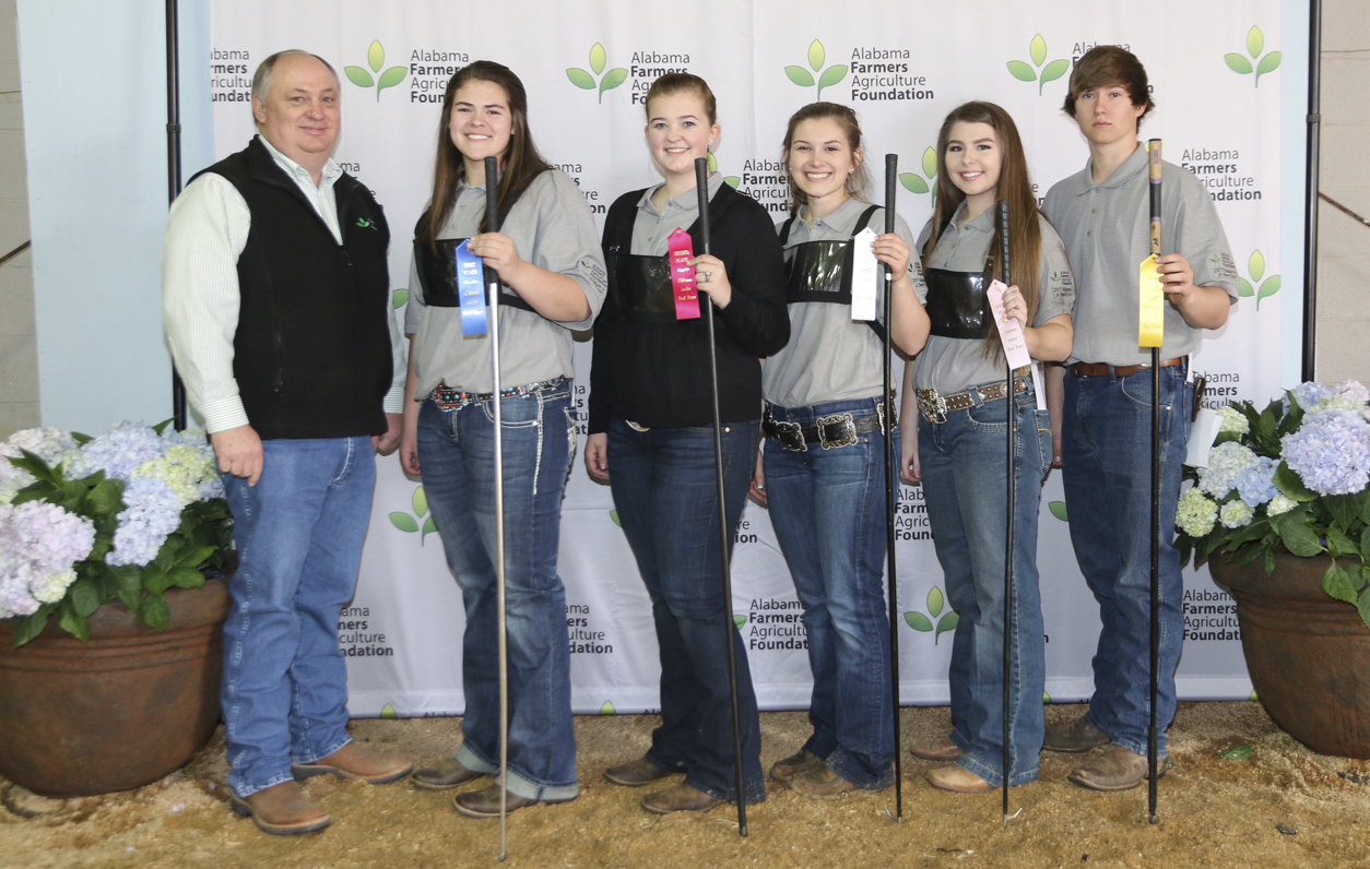 Class 4 Senior Showmanship winners at the 2017 Alabama Junior Beef Expo are pictured with Alabama Farmers Federation President Jimmy Parnell. From left are Parnell; Hannah Maddox of Collinsville in DeKalb County, first place; Sarah Parker of Lanett in Chambers County, second; Ashlyn Ruf of Athens in Limestone County, third; Sydni Benefield of Cullman in Cullman County, fourth; and Dalton Andress of Cottonwood in Houston County, fifth.