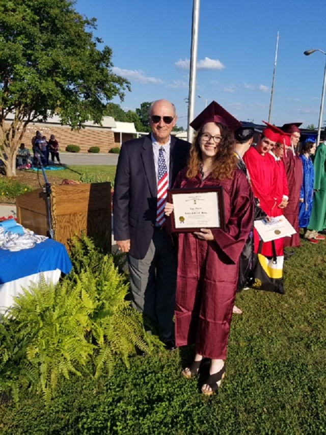 Col. Ken Brown, president of the Cullman chapter of the Sons of the American Revolution (SAR) presented the SAR Bronze Medal of Achievement to JROTC Cadet Staci Prater of West Point at Tuesday's graduation ceremony for students of the Cullman Area Technology Academy in Vinemont. The award recognizes her outstanding leadership qualities and military bearing.