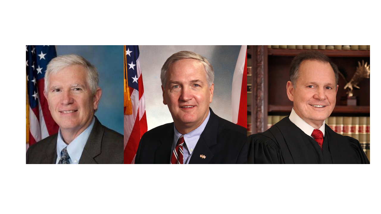 U.S. Rep. Mo Brooks, left, U.S. Sen. Luther Strange, center, and Roy Moore, right, will be special guests of the Cullman County Republican Party at a dinner Friday night, July 28, 2017. / Images courtesy of the U.S. House of Representatives, U.S. Senate and the State of Alabama