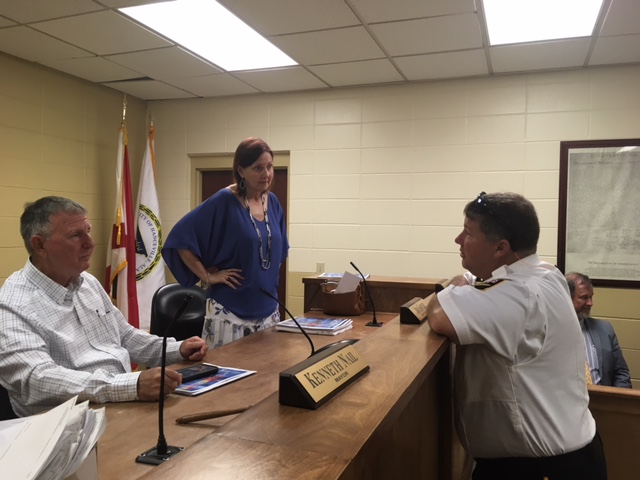 Hanceville Assistant Fire Chief Bart Absher confers with council members Jimmy Sawyer and Sharon Porter./ W.C. Mann