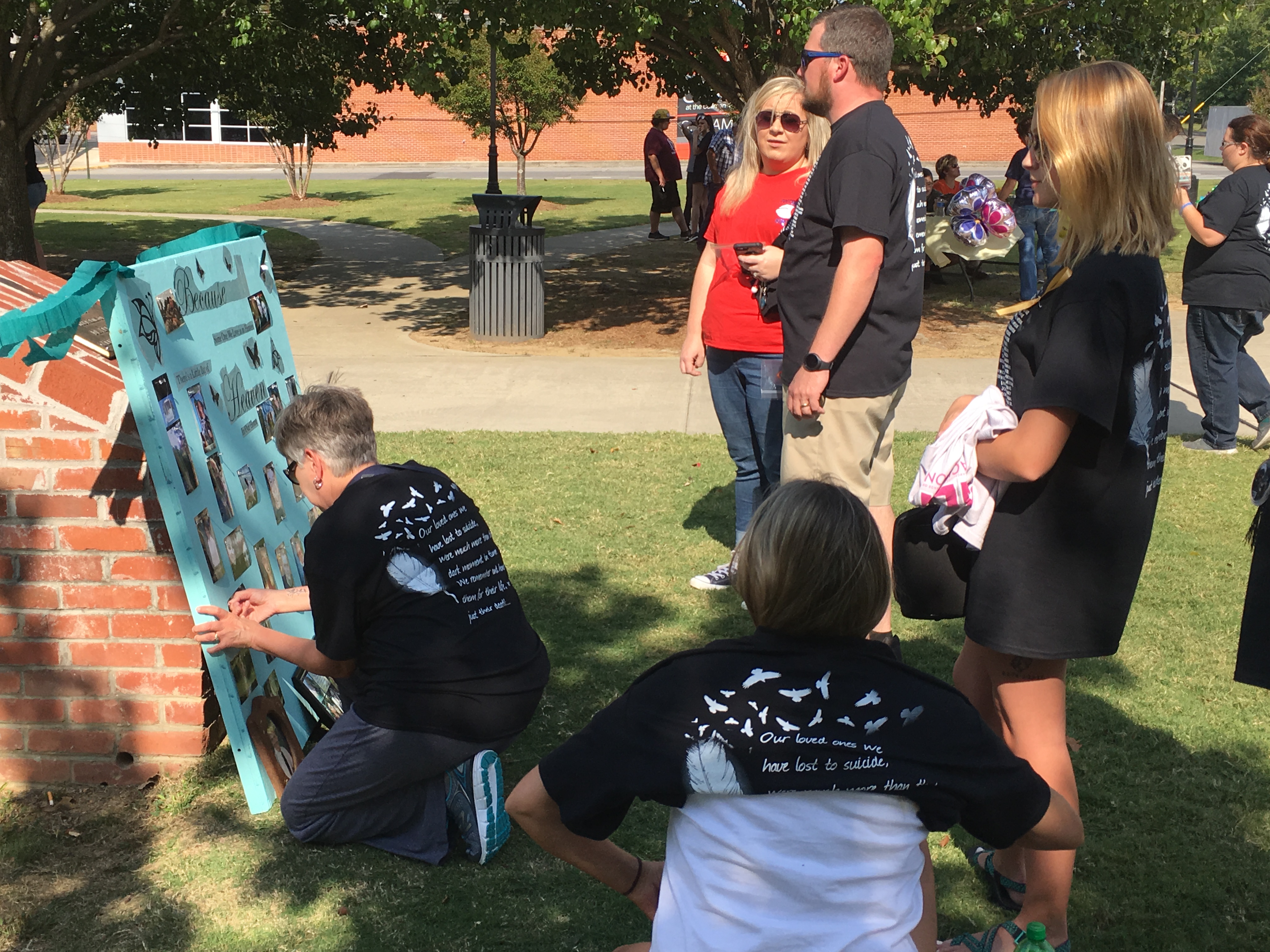 The Cullman High School Chamber Choir and members of the Fairview High School FFA String Band performed. Volunteers offered face painting and helped kids paint rocks. Greater Love Ministries offered free Bibles. At one booth, visitors could pin on ribbons in memory of lost loved ones, or in honor of survivors. X-Ternal X-pressions displayed samples of tattoo designs based on the semicolon, which has become the logo of a suicide prevention project whose slogan is “My story isn’t over yet.”