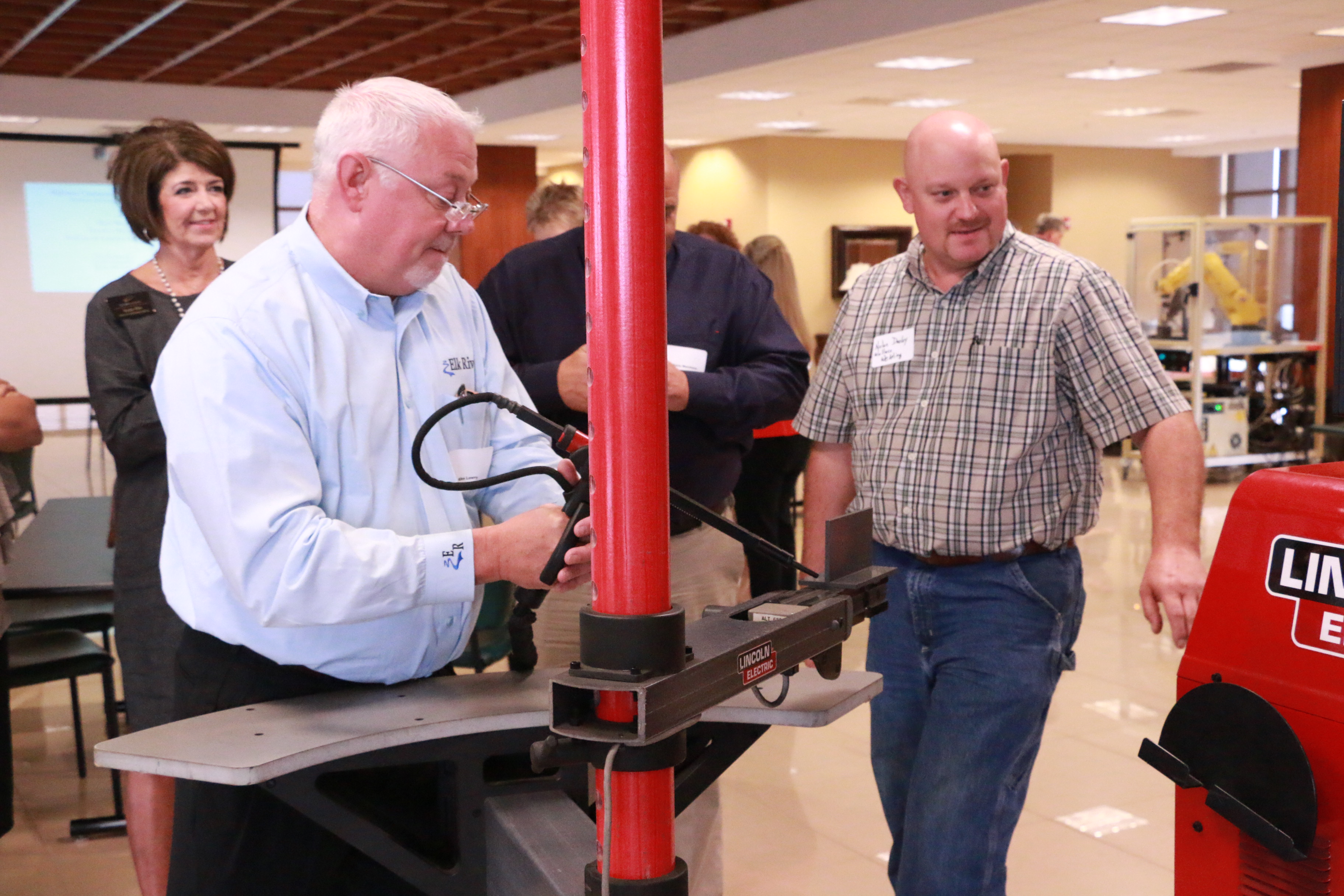 Mike Lowry, director of marketing at Elk River, Inc., takes his turn practicing on the Wallace State virtual welder as instructor Nolan Dooley, right, looks on.