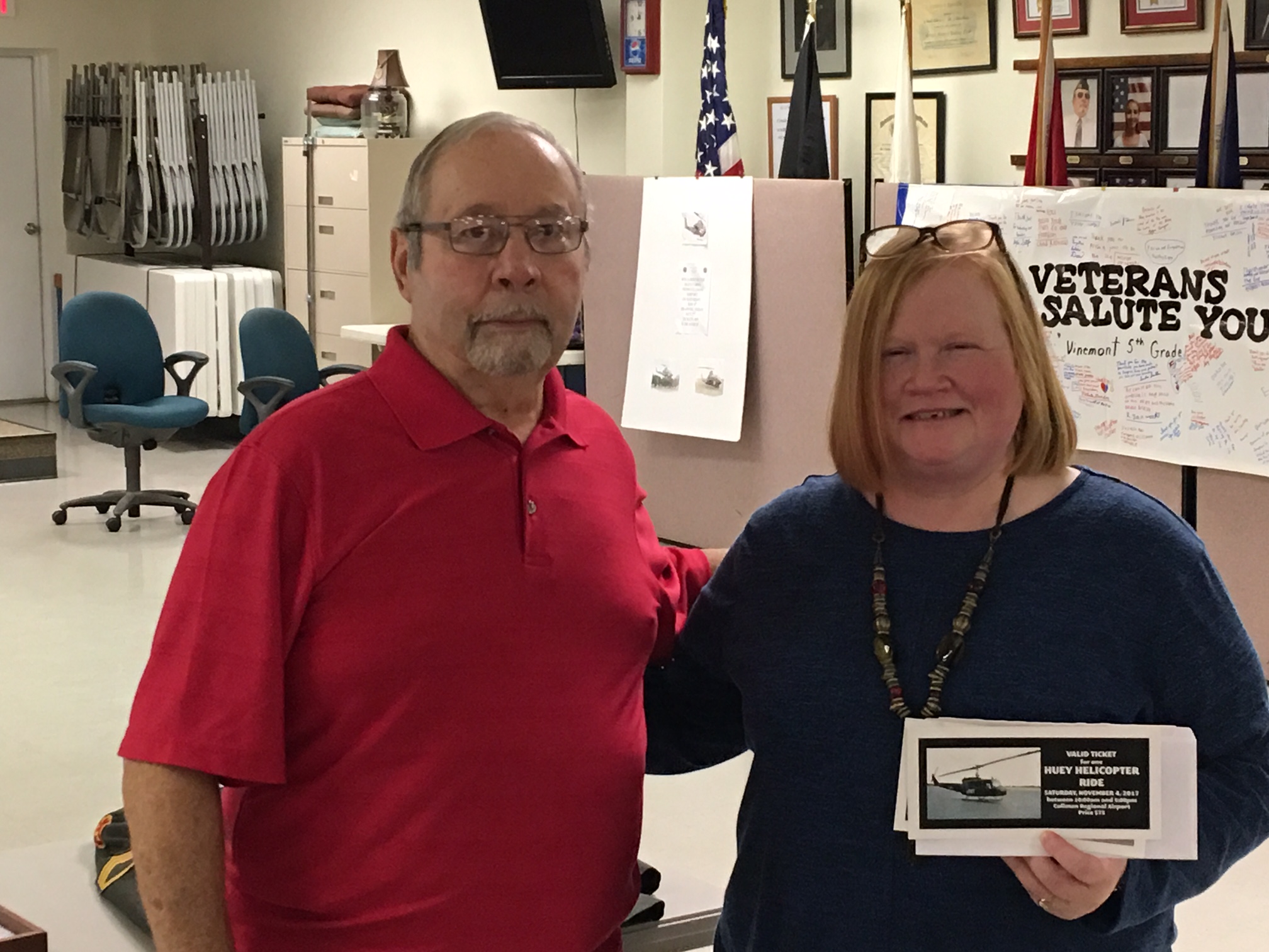 Pictured is VFW Commander and Vietnam Veteran Jerry Willibey presenting the Huey ride tickets to Bridget at the VFW weekly lunch this Tuesday.