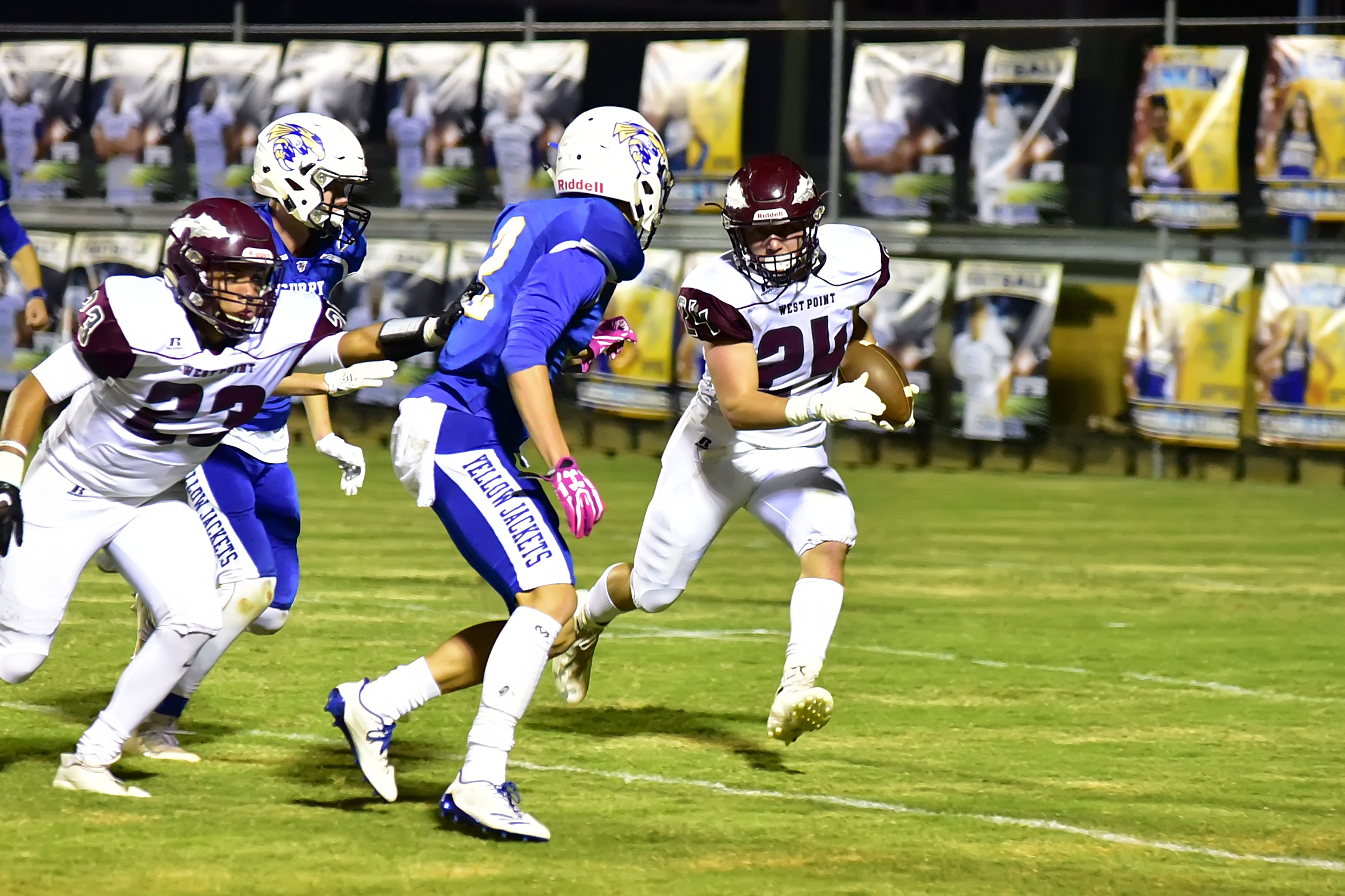JASPER – The West Point Warriors traveled to Jasper to take on the Curry Yellow Jackets in a regional matchup Friday night. It didn’t start out well for the Warriors, but they weathered the storm, walking away victorious, 27-18, in this seesaw game and securing their spot in the playoffs.