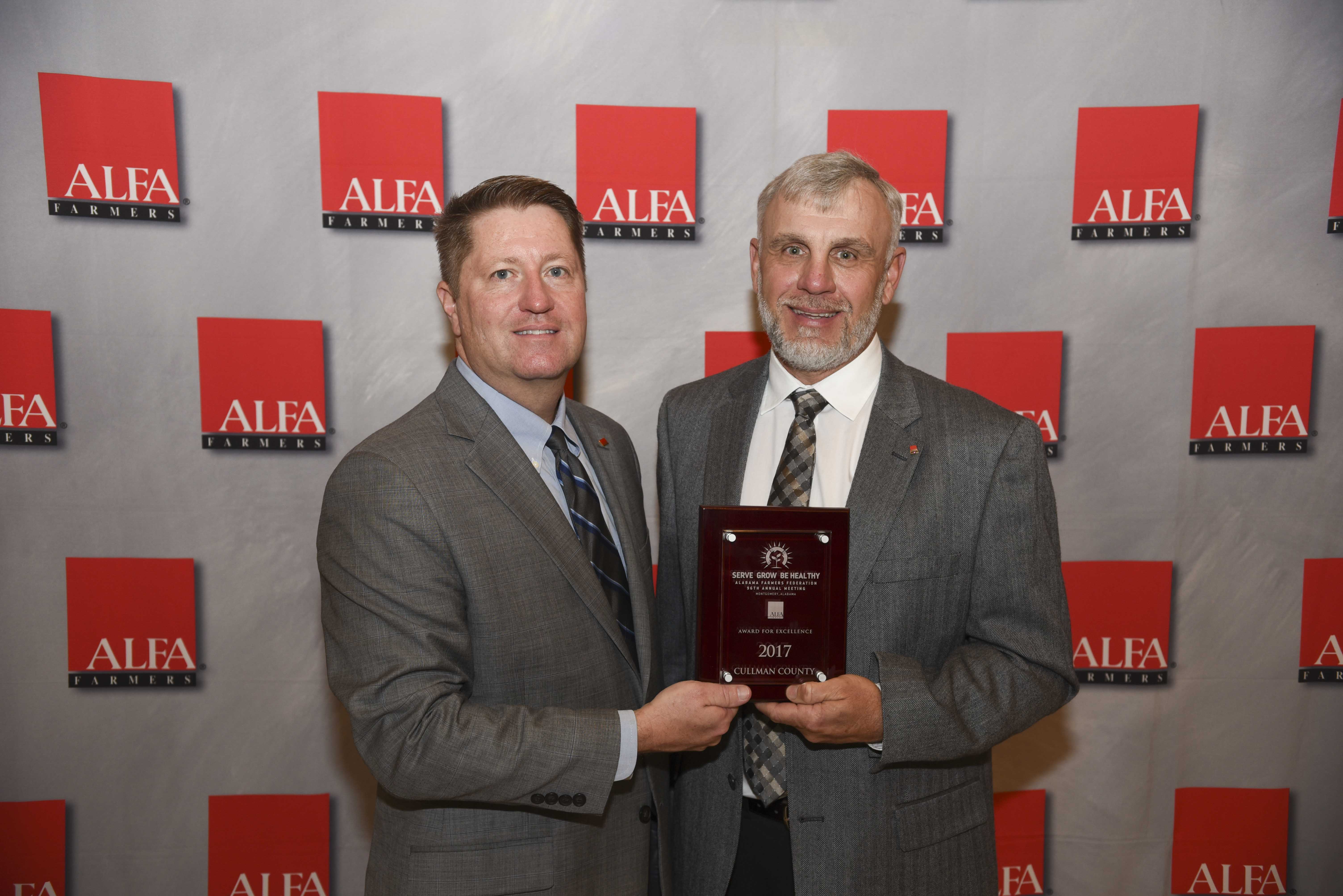 The Cullman County Farmers Federation received the Award for Excellence Dec. 4. at the Alabama Farmers Federation’s 96th annual meeting in Montgomery. The award recognizes counties excelling in five sections of the Federation: organization, agricultural programs, governmental affairs, and the county’s Women’s Leadership and Young Farmers committees. Cullman County Farmers Federation President Steve Lake, right, accepted the award from Federation Executive Director Paul Pinyan. / Alfa Farmers
