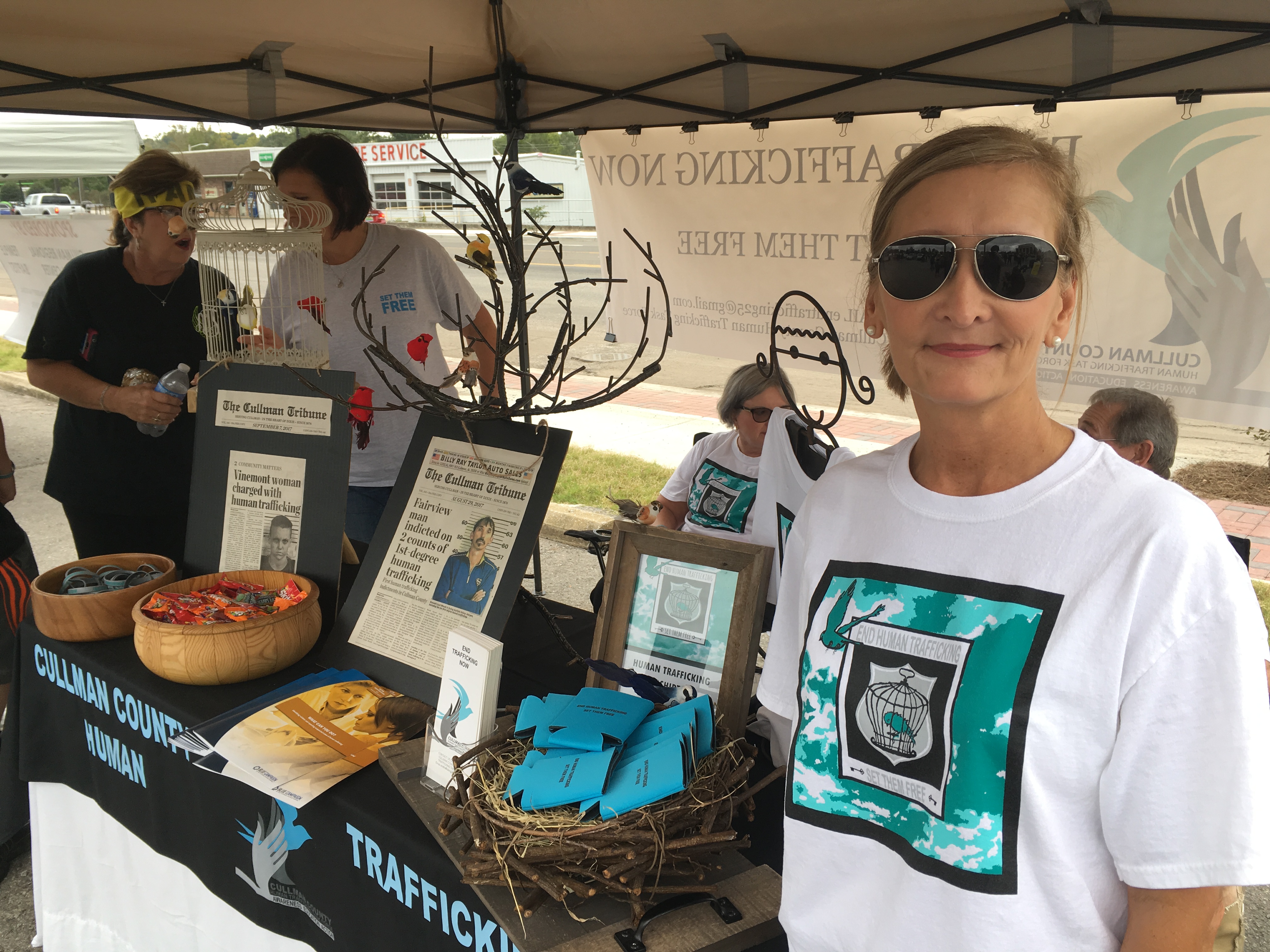 At an awareness event in October, Cullman County Human Trafficking Task Force Chair Kathy Wilson, right, displayed Tribune articles on the county’s first two human trafficking arrests. / Tribune file photo