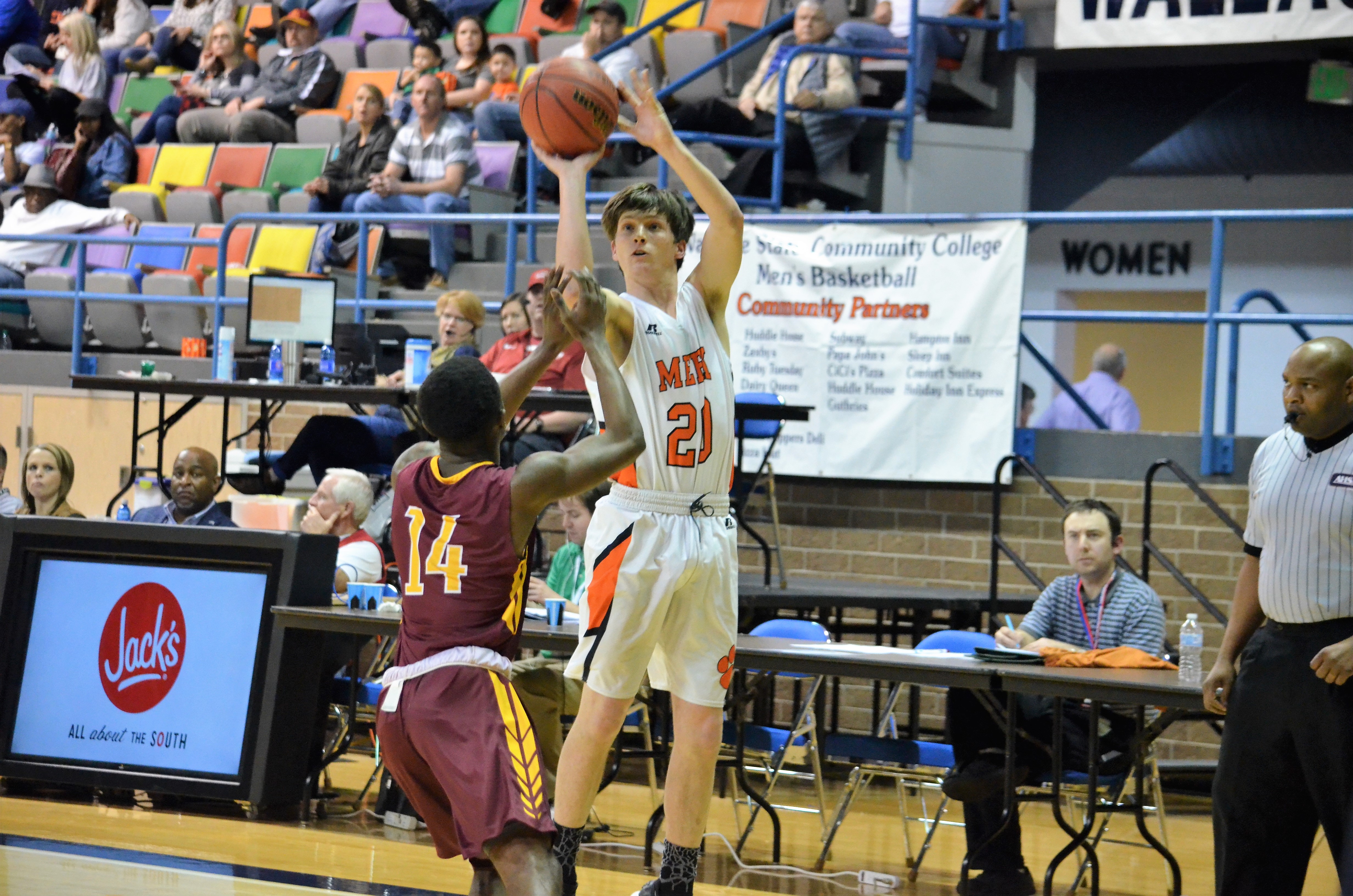 Meek’s Payton Key (20) getting a shot off against South Lamar Friday night in the Northwest Regional Tournament at Wallace State. / Nick Griffin