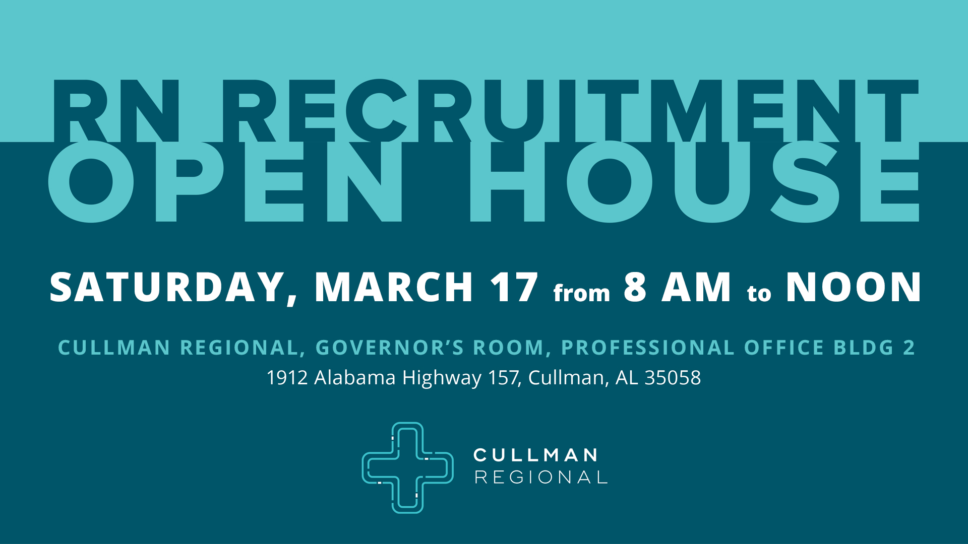 The RN Recruitment Open House will be held on Saturday, March 17 from 8 a.m. to noon in the Governor’s Room, located in Professional Office Building 2 on the Cullman Regional Campus (1912 Alabama Highway 157, Cullman, AL 35058).