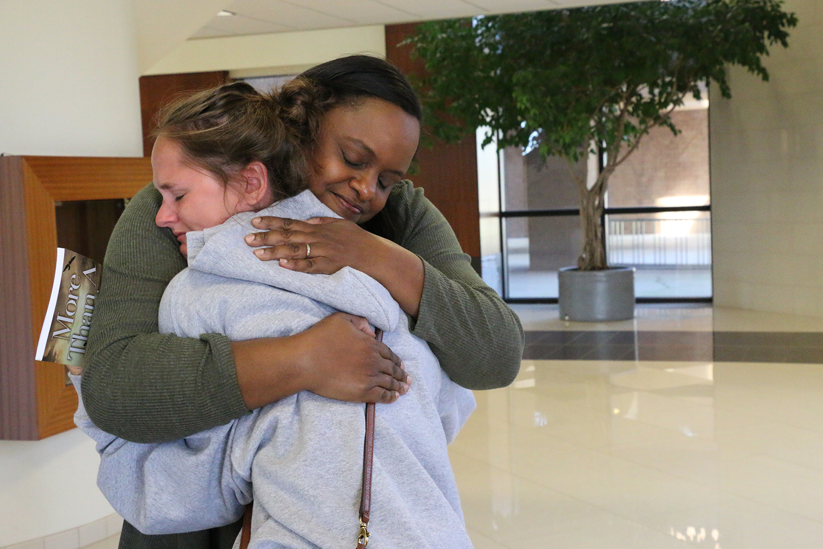 Huntley embraces Mary Ann Wolfe, a student at Wallace State, who was moved by her story.