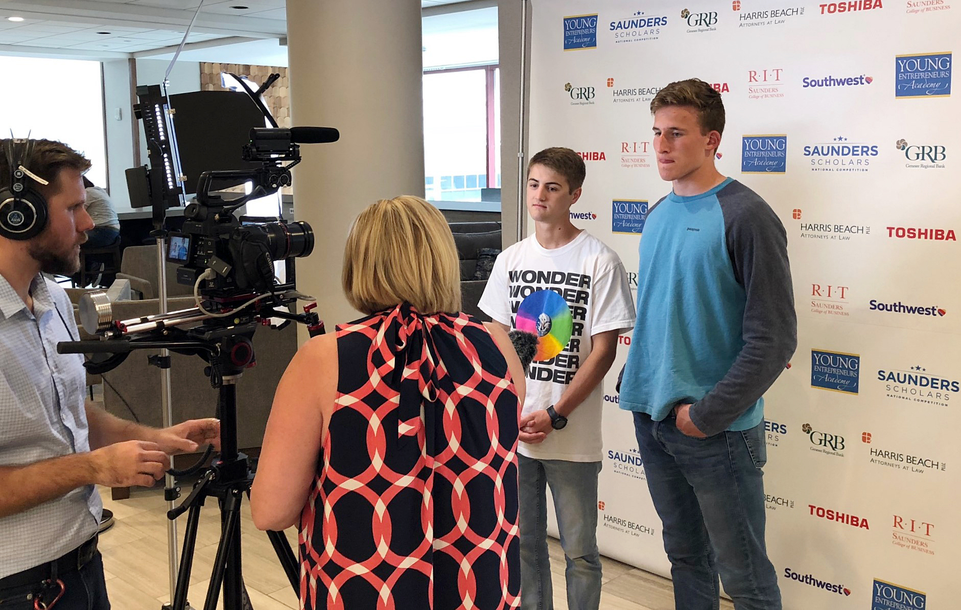 YEA Instruct Inc: Local YEA! and Cullman High School students Zane Manley, right, and Parker Van Dyke take their turn in front of the video camera shortly after arriving in New York for the Saunders Scholars National Conference & Competition. (Cullman Area Chamber of Commerce & Visitor Center)