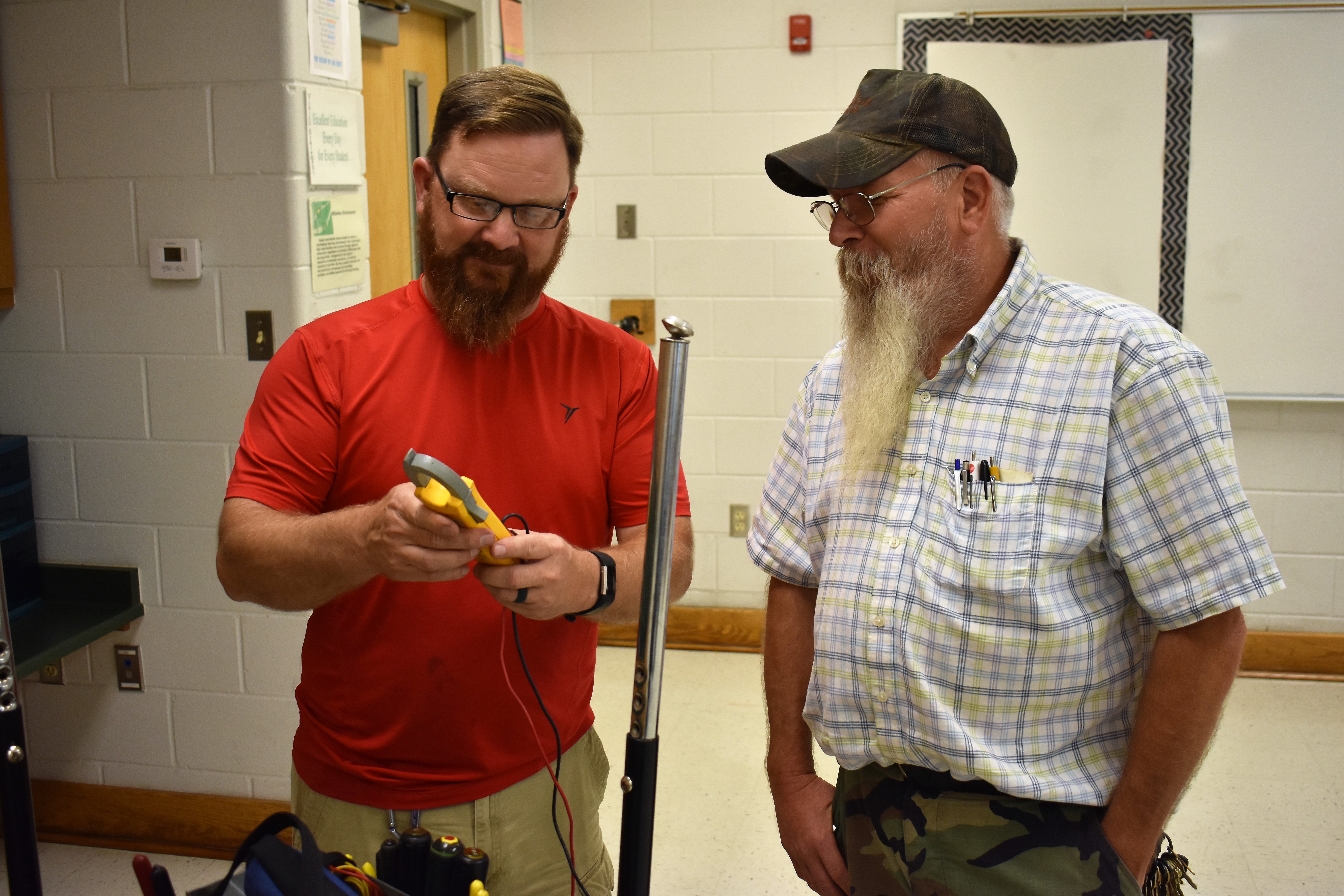 Phillip White and Ricky Smith check an electrical multimeter at Holly Pond Middle School. (W.C. Mann for The Tribune)