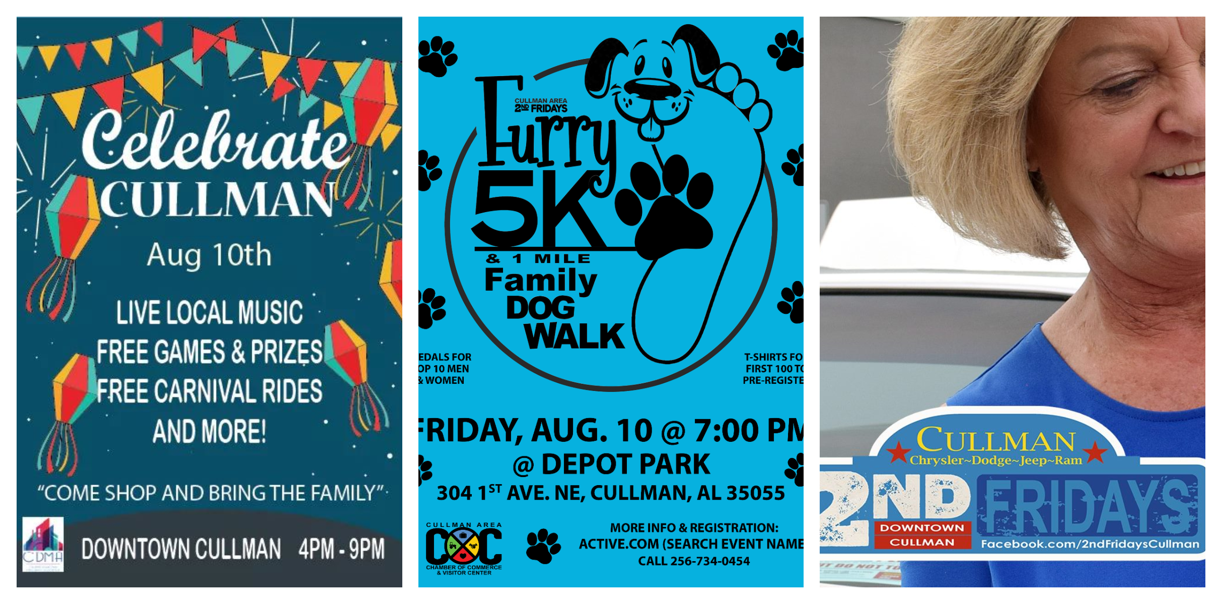 The inaugural Cullman Area 2nd Fridays Furry 5K and 1-Mile Family Dog Walk begins at 7 p.m. Both the 5K and walk will start and finish at Depot Park. The 5K route will take runners around Cullman High School, by Stiefelmeyer Park and up Fourth Avenue Northwest back toward the event area.