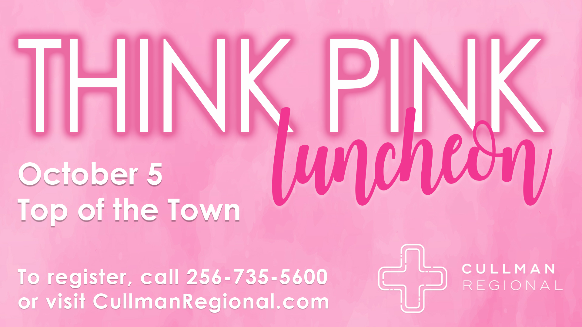 The Think Pink Luncheon will be held on Friday, Oct. 5 from 11:30 a.m. to 1 p.m. at Top of the Town (316 Second Ave. SW). Tickets are $20 per person or $150 for a table of eight. To purchase tickets, call 256-735-5600 or register online at www.CullmanRegional.com.
