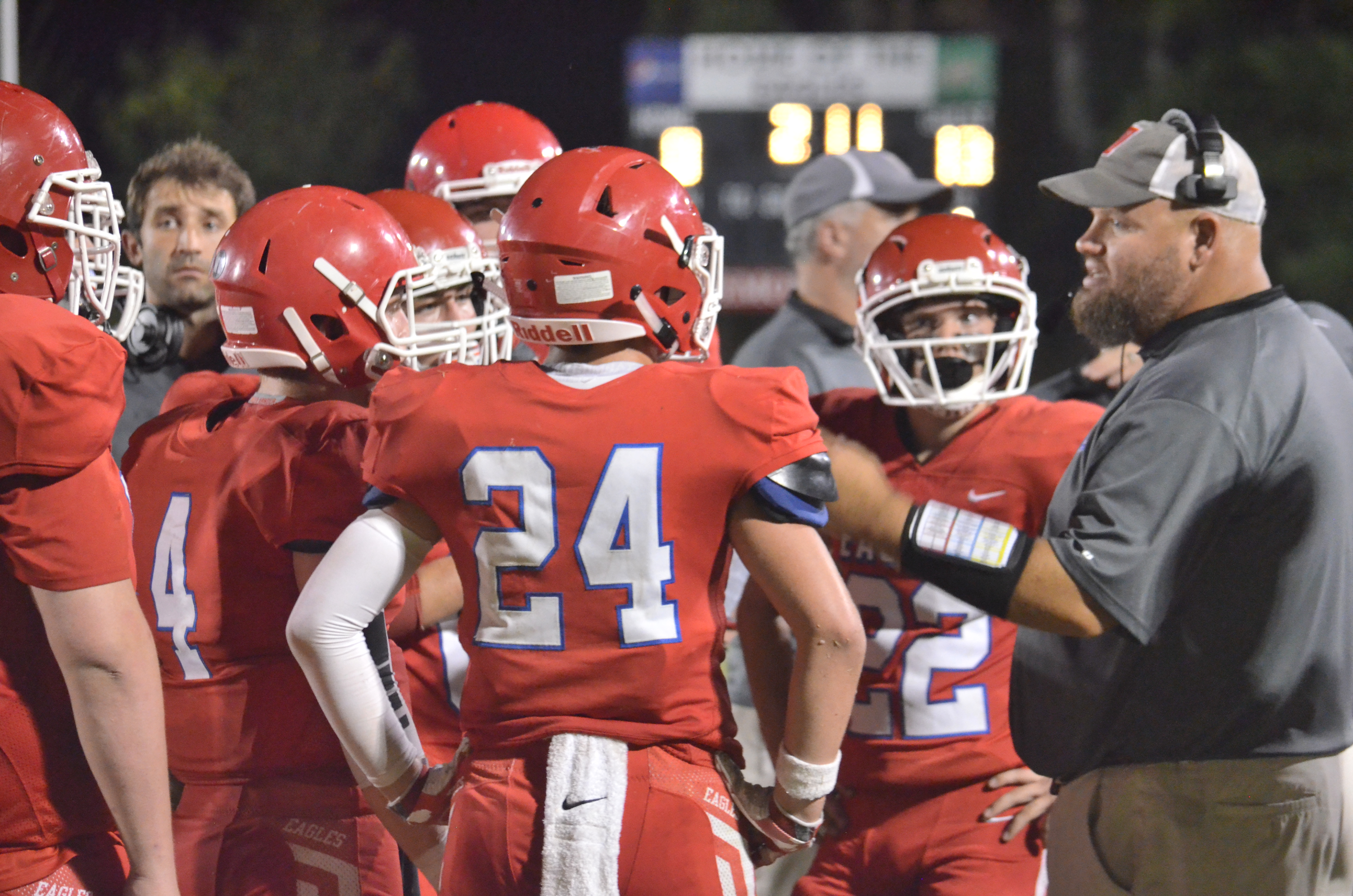 Eagles Head Coach Stephen Robinson talks with his offense during Friday night's loss to Fultondale. (Nick Griffin for The Cullman Tribune)