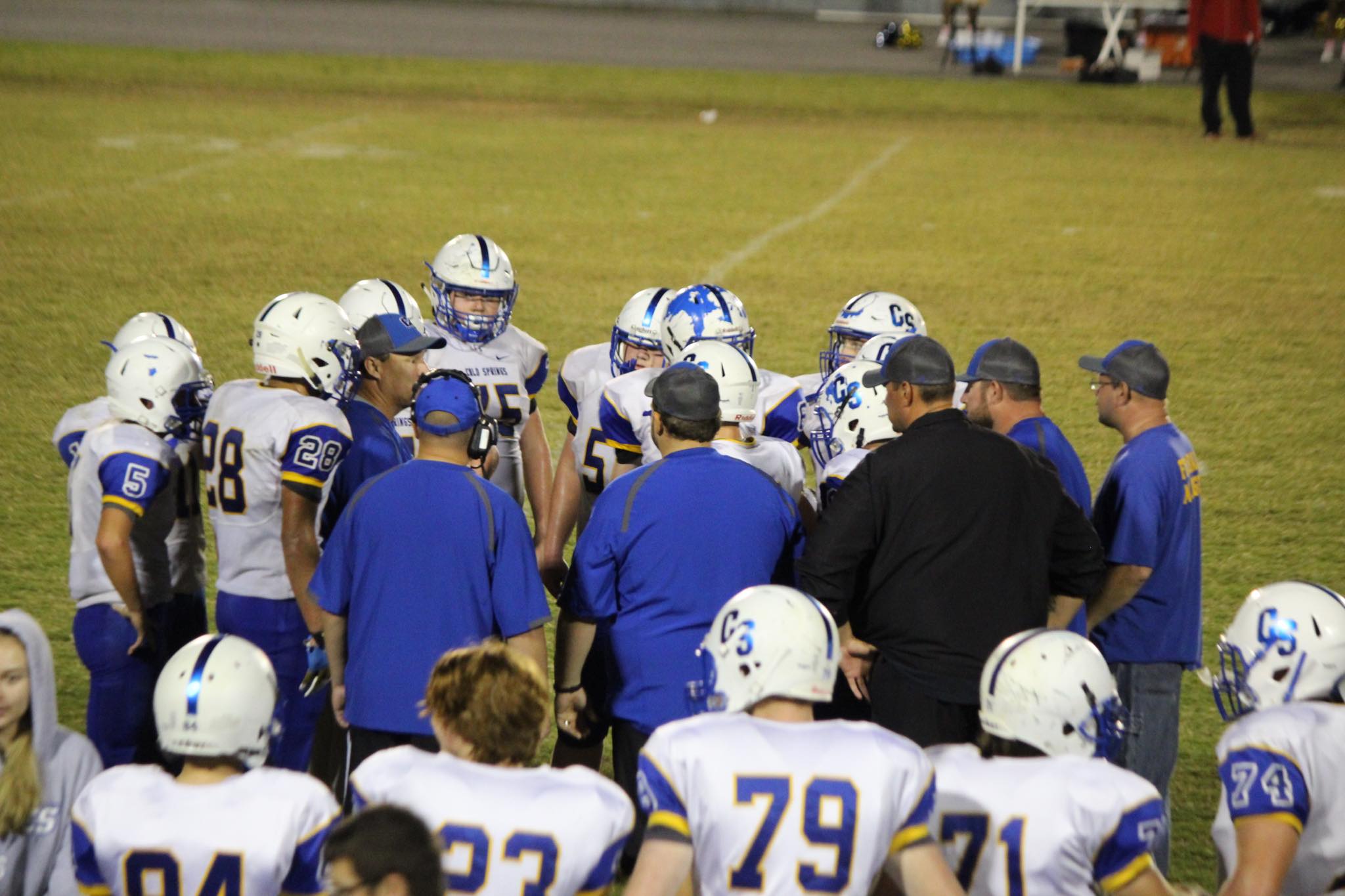 Eagles Head Coach Rod Elliott talks to his team during a timeout in Friday night’s matchup with Tarrant. (Destiny Campbell for The Cullman Tribune)