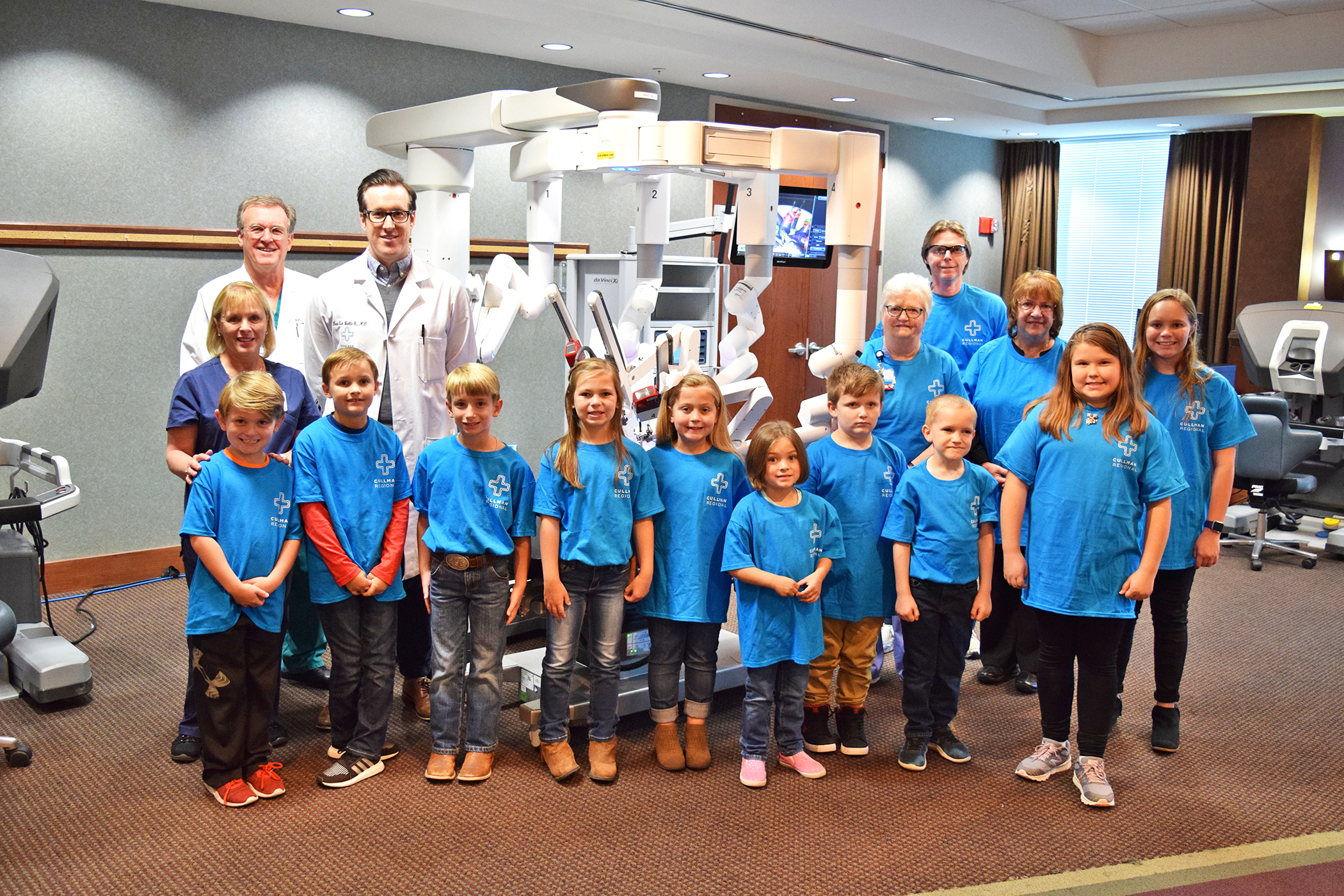 The winners of the Name the Robot Contest are pictured in front of the da Vinci robot. Pictured from L-R, front row: Nolan Nobinger, Jackson Dossey, Louis McGraw, Bailey Wilkerson, Braylea Prince, Annabella Rose Griffin, Brayden Vanderburg, Ethan Thomas, Savannah Bischoff; second row: Betsy Karr, surgical services director; Urologist Lars Erik Walllin, III, MD, robotic surgery medical director; Sissy Warnick, Kathy Atkins and Madison Clements; Third row: William Smith, MD, chief medical officer and John Buress