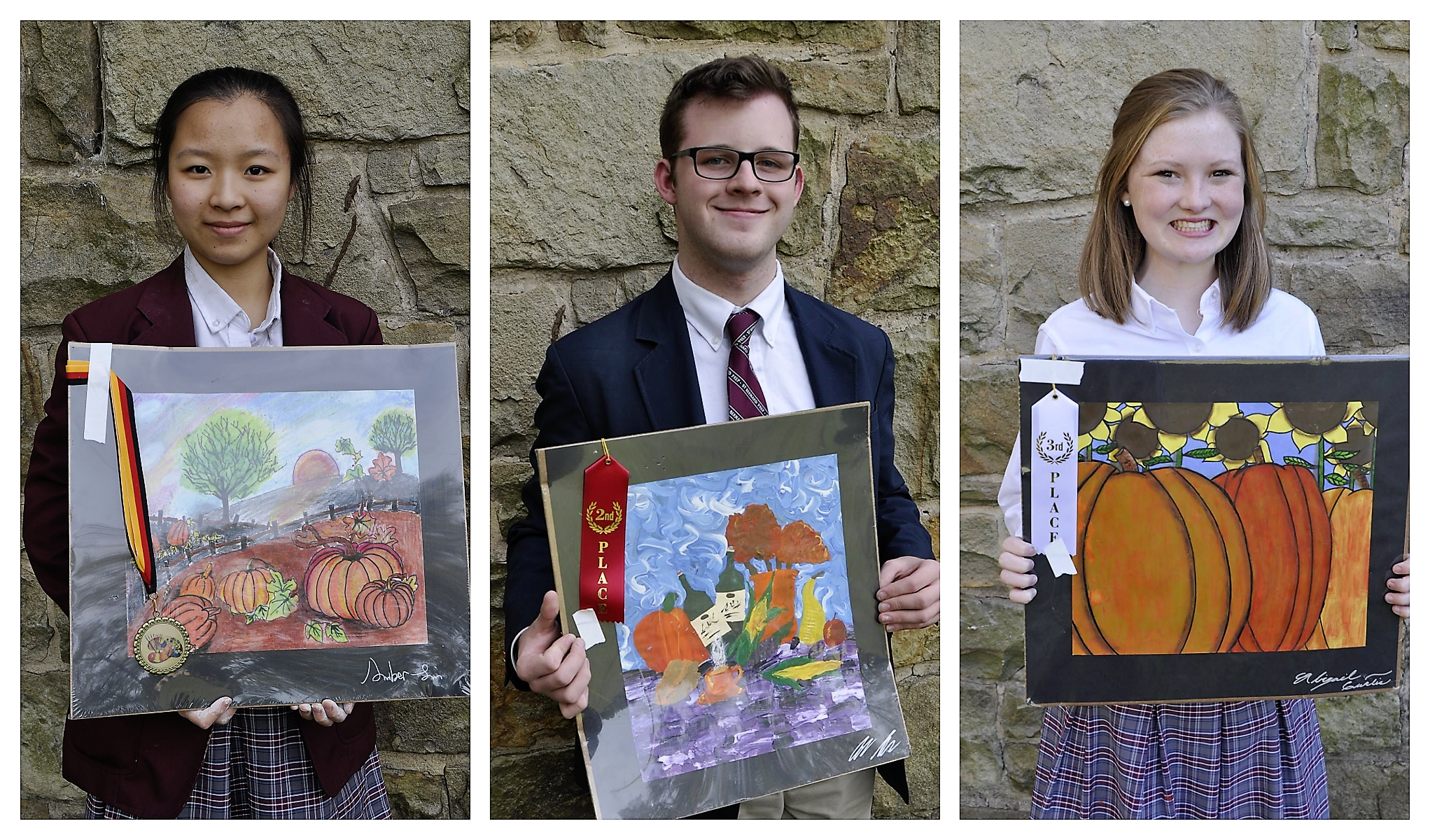 In October, St. Bernard art students participated in the Cullman Oktoberfest art competition. (Left to right) Amber Lin received top honors with the Heritage Award; Josh Spitzer won second place and Abigail Curtis took home the third-place ribbon. Congratulations to each of these talented students and to their instructor, Ms. Sharon Collier.