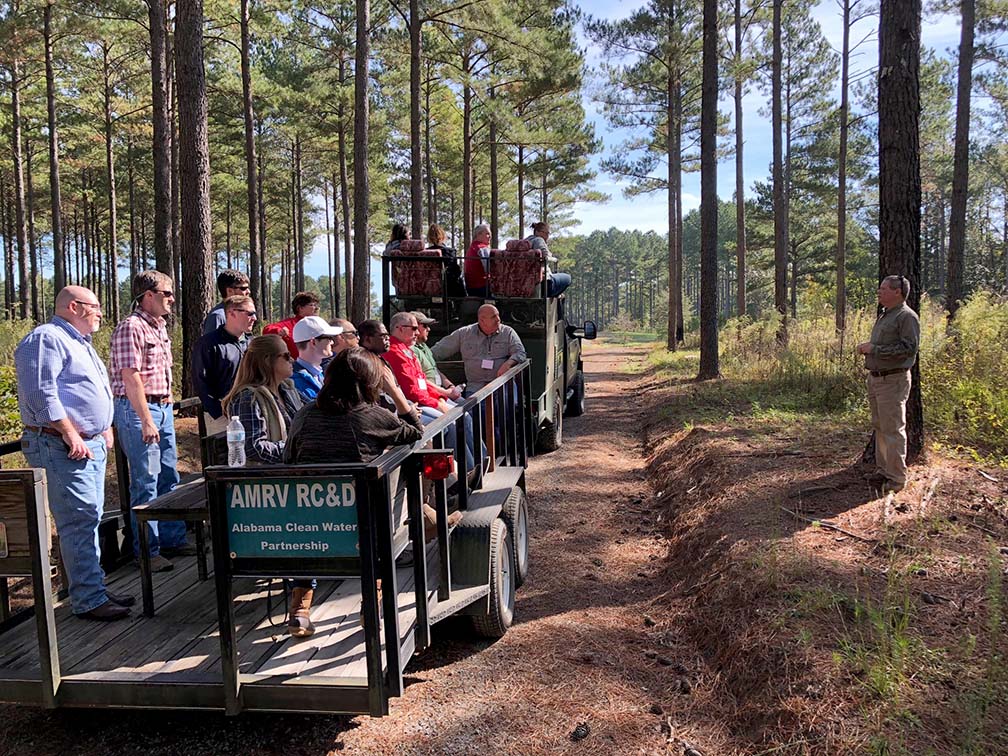The other agriculture stop took the tour group to the southern border of Cullman County to visit Riverwood Farms where owners Stan and Suzanne Wood — the 2018 Farm-City Family of the Year — hosted lunch and gave a tour. The Woods purchased the property, formerly owned and managed by International Paper, more than a decade ago. They have continued to manage the timber supply across more than 1,400 acres while also developing a beautiful private hunting camp as well as their home, which serves as a wonderful weekend and holiday gathering place for their family and friends.