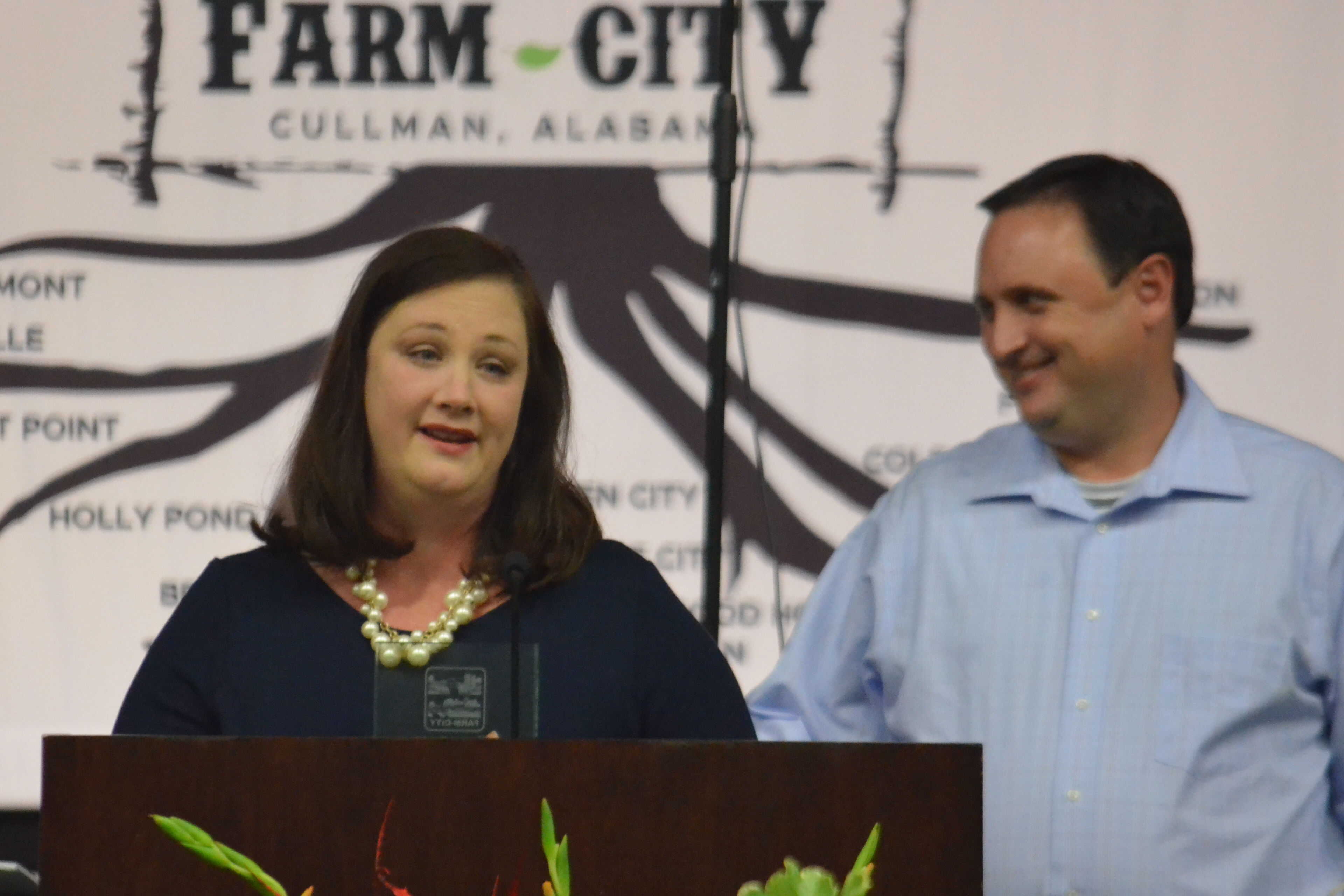 Melissa Betts speaks Thursday night at the annual Farm-City Banquet after she and her husband Jay Betts, looking on, were named the 2019 City Family of the Year. (Nick Griffin for The Cullman Tribune)