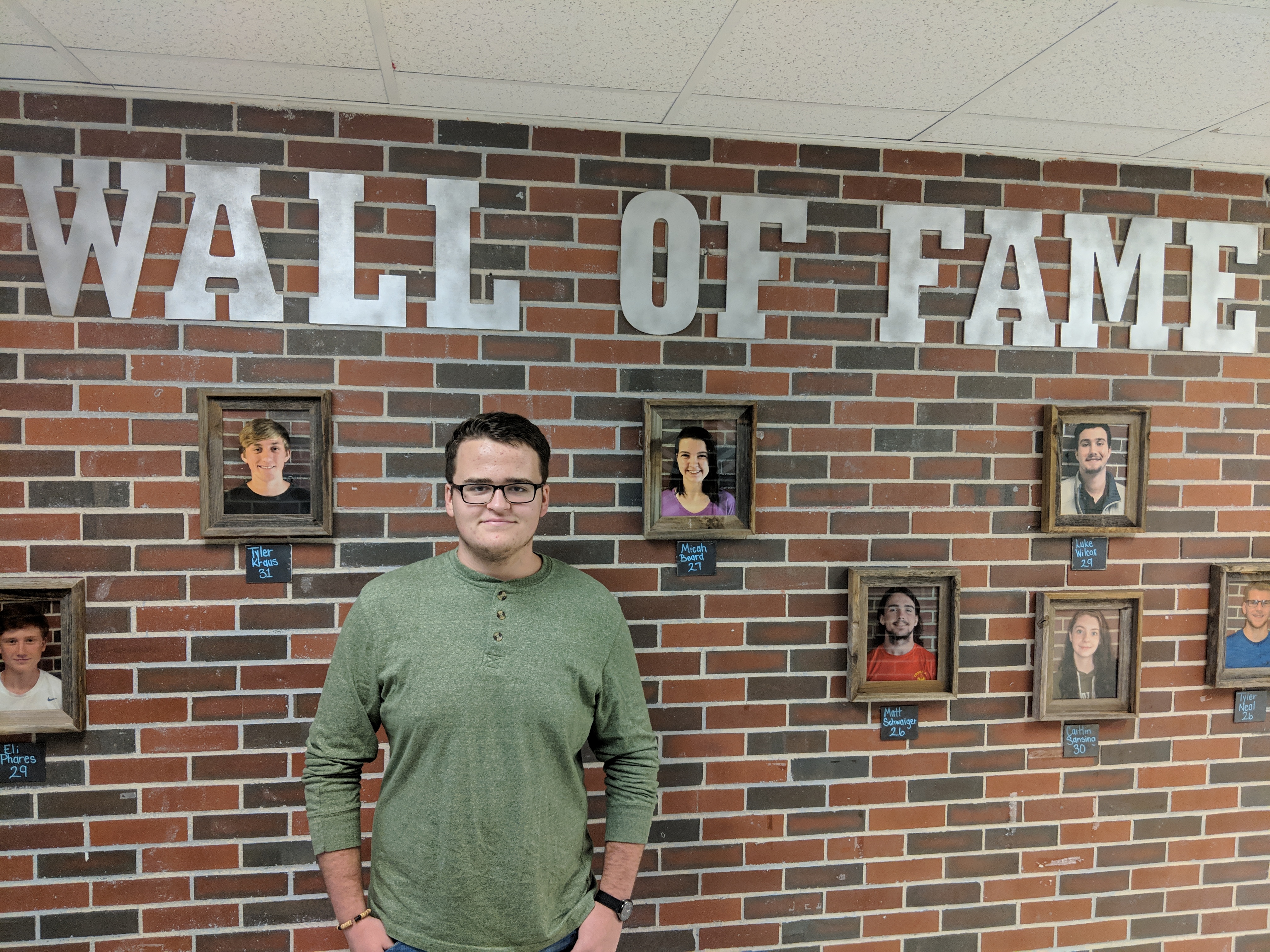 James McWhorter poses in front of the Good Hope High School ACT Wall of Fame (Heather Mann for The Cullman Tribune)