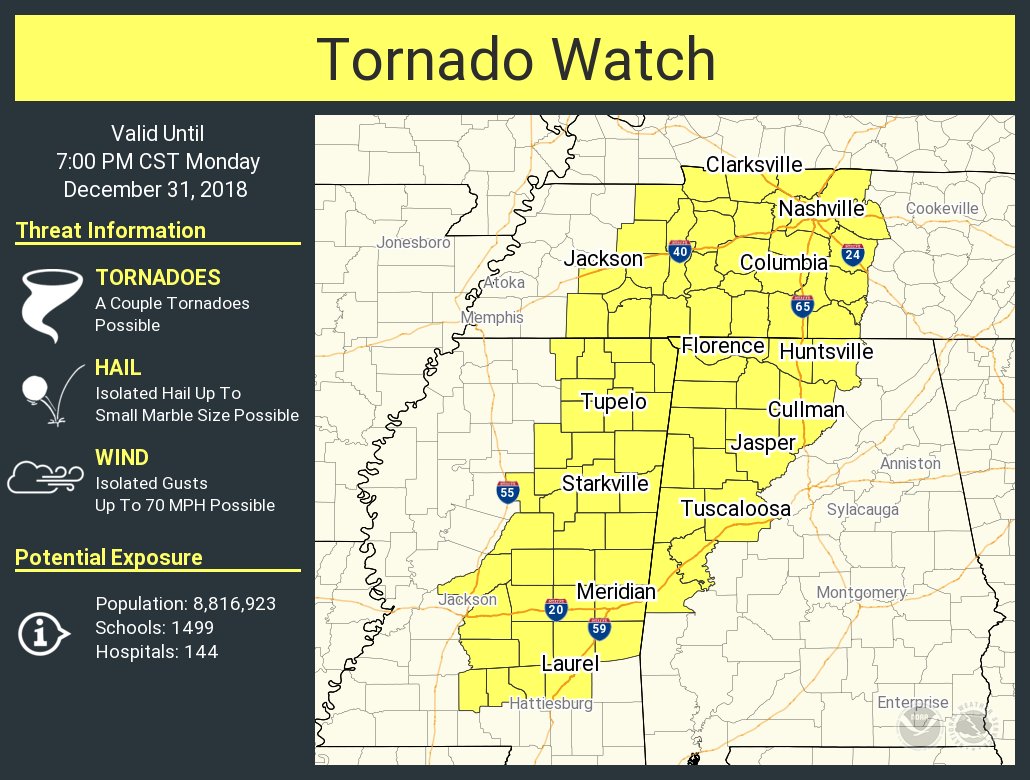 HUNTSVILLE – The National Weather Service in Huntsville has issued a Tornado Watch for an area including Cullman County. The watch is in effect until 7 p.m.