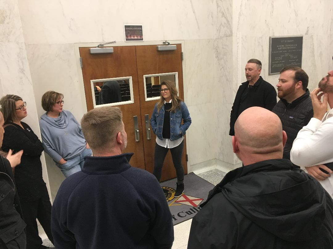 For a second week, Rock the South producers Shane Quick and Nathan Baugh, third and second from right, met informally with local residents after the Cullman City Council meeting Monday night. (W.C. Mann for The Cullman Tribune)