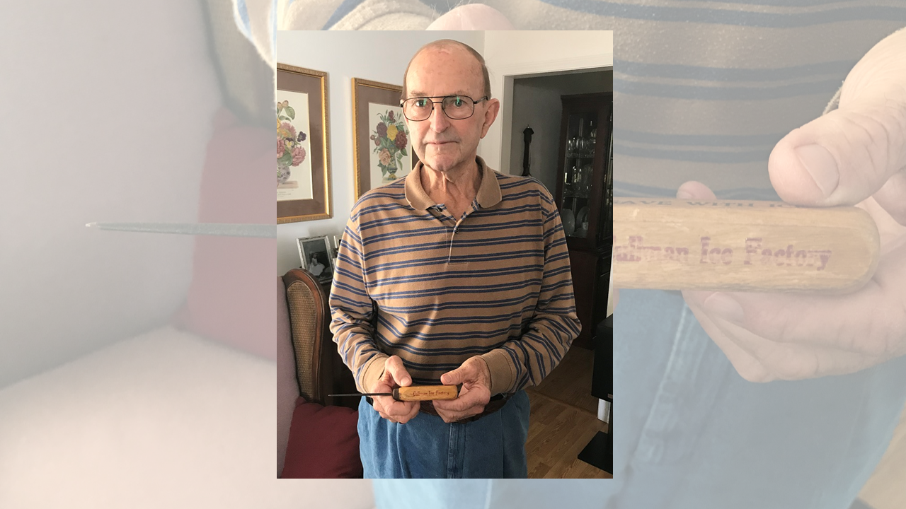 Frutiger still holds on to his ice pick from his summer working at the ice factory. The inscriptions on the four-sided handled are still visible. The sides read Cullman Ice Factory, Ice and Coal, Save with Ice, and 34 & 22. The numbers were the phone numbers. The ice pick was used to break the blocks down.