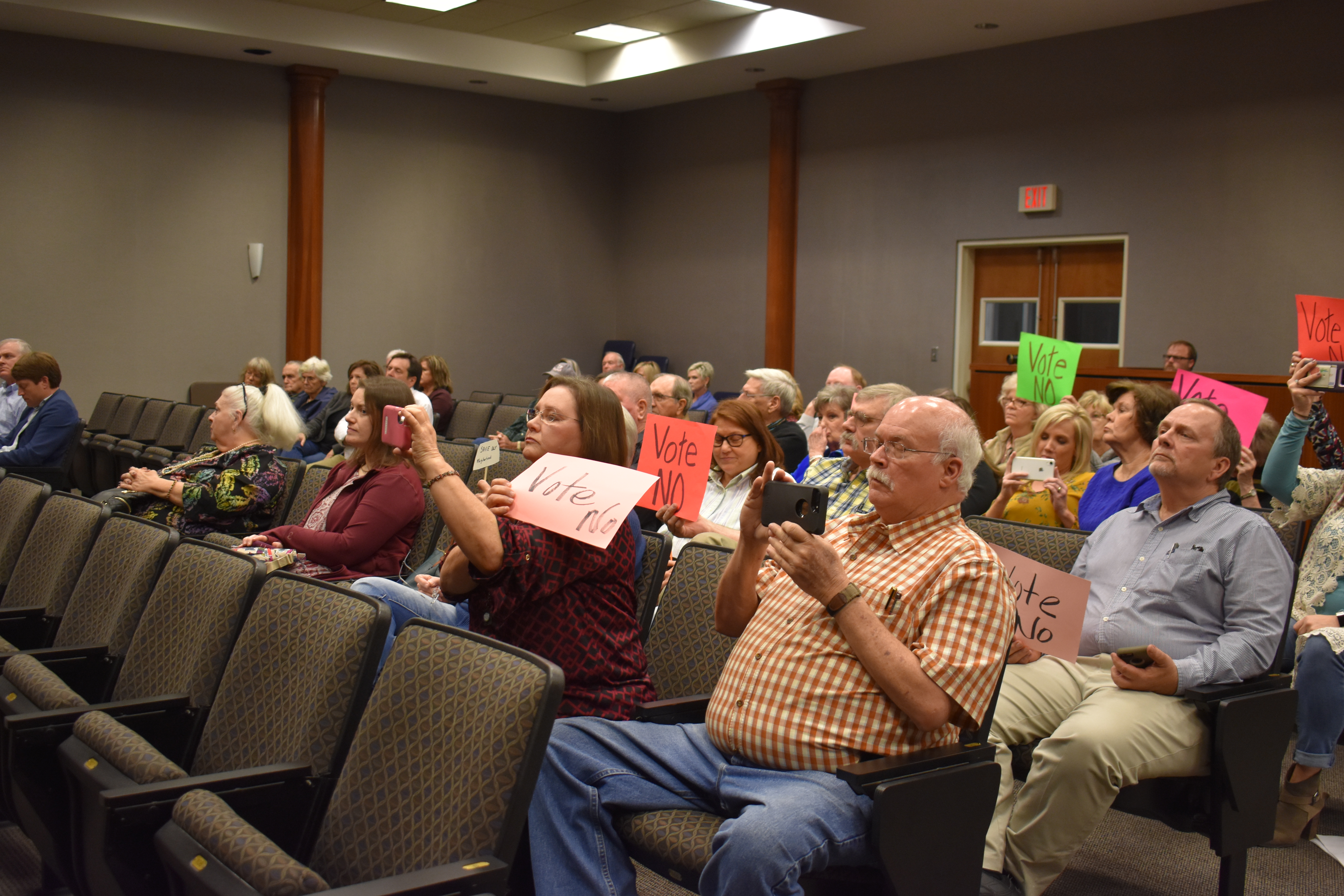 Voss then set the matter before the other commissioners. Before a crowd displaying "Vote No" signs and holding up cell phones to record the proceedings, the request received a motion to recommend, but no second. With that, the motion to recommend died. A second motion, this time not to recommend, also received no second and died as well.