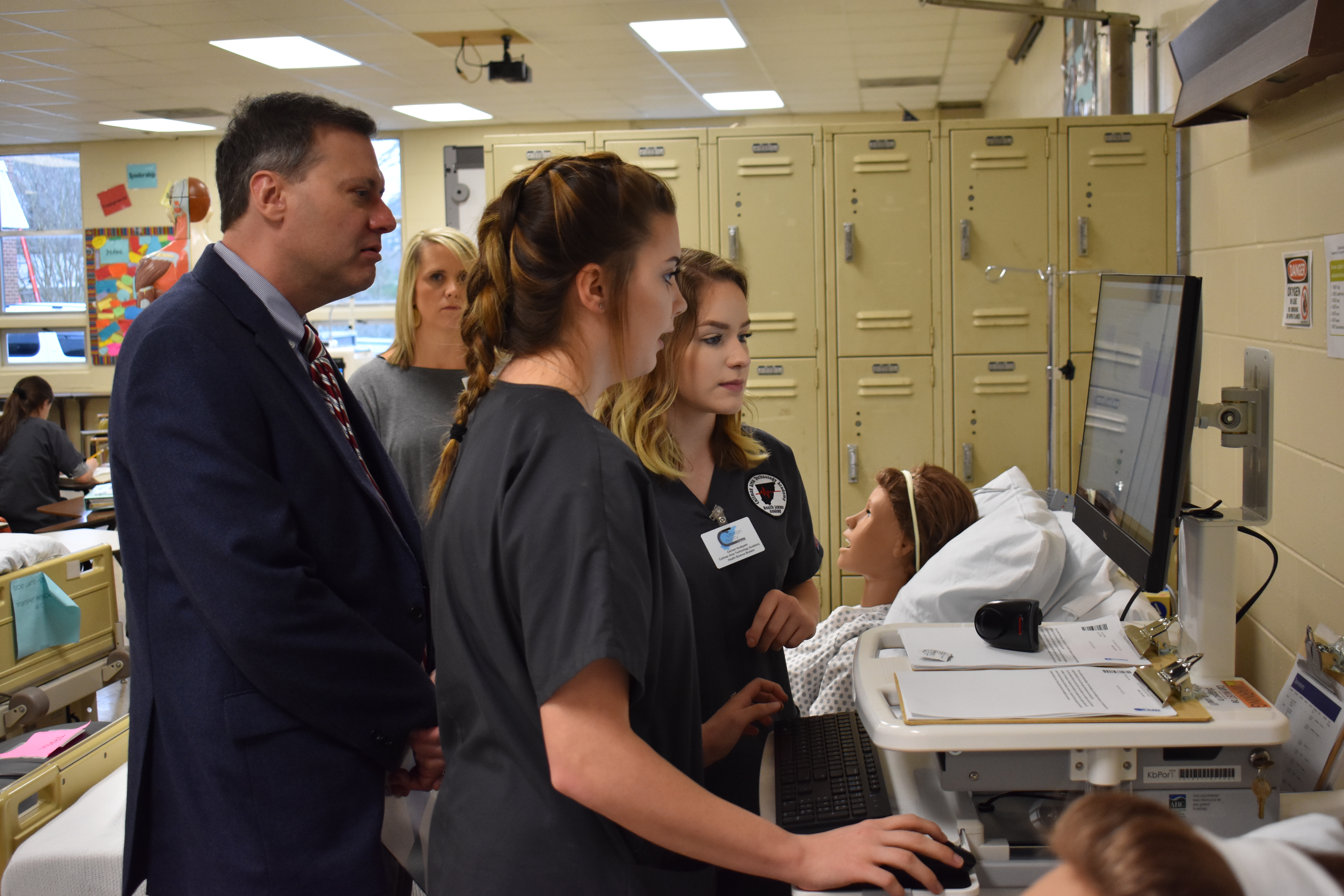Health Sciences teacher Tracy Smith looks on as Hanceville seniors Destiny Short and Gracie Hudspeth explain their use of medical simulation training equipment to Appalachian Regional Commission Federal Co-Chair Tim Thomas. (W.C. Mann for The Cullman Tribune)