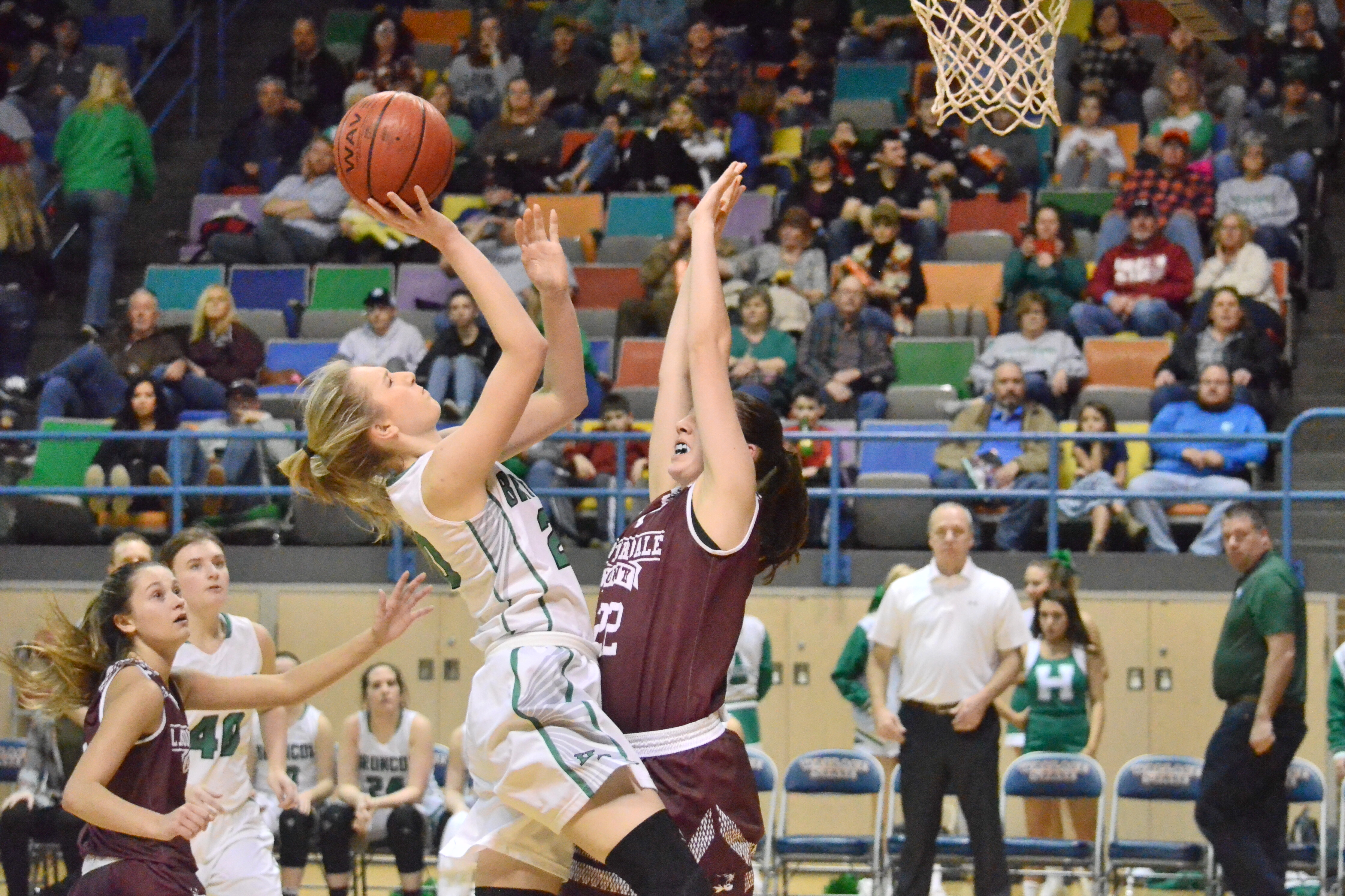 Kirsten Campbell (20) attacks the basket during Holly Pond's 47-32 loss to Lauderdale County Saturday night. (Nick Griffin for The Cullman Tribune)
