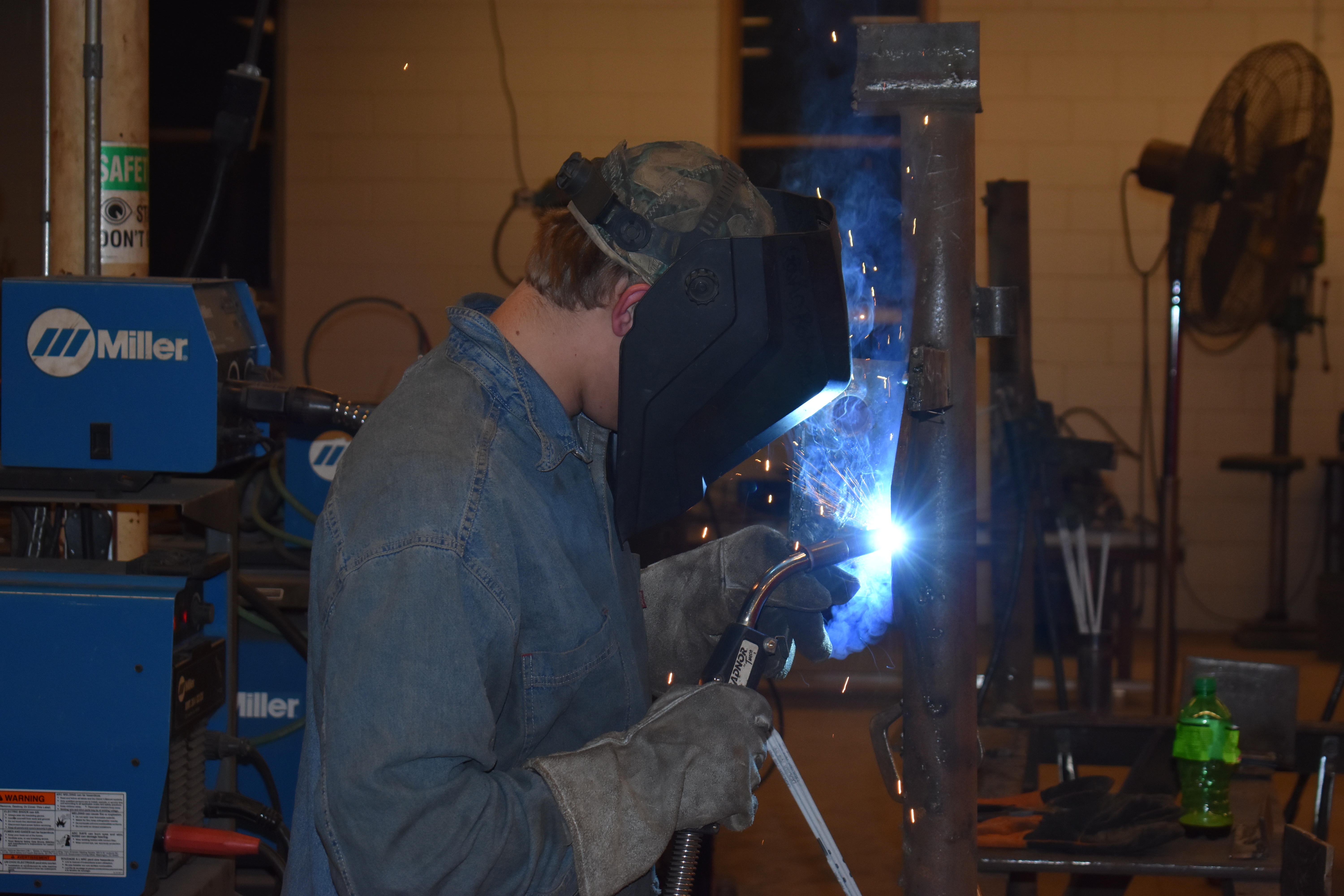 Senior Brody Montgomery demonstrates welding at the Cullman Area Technology Academy Open House Thursday night. (W.C. Mann for The Cullman Tribune)
