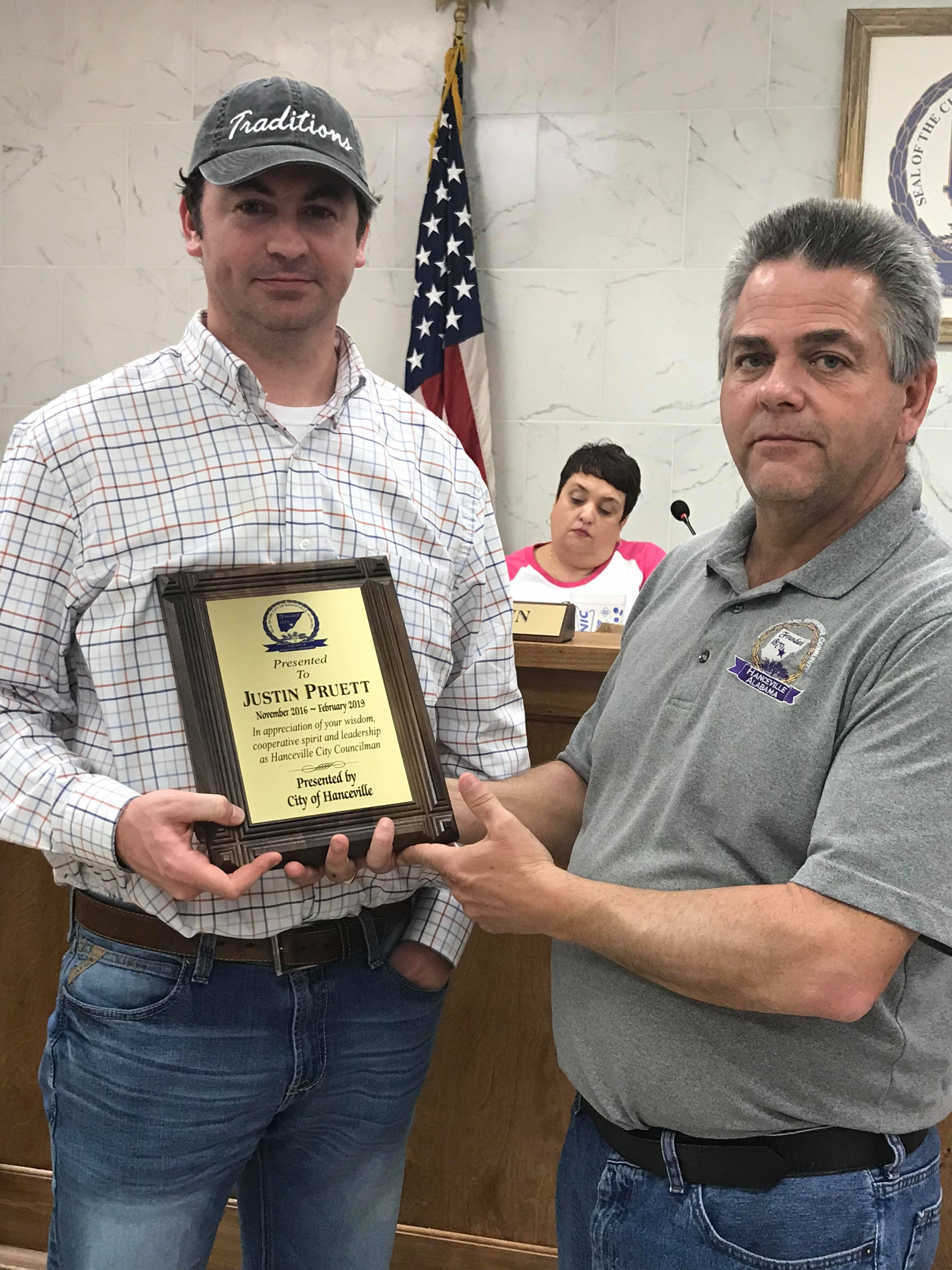 Mayor Kenneth Nail presented Pruett with a plaque in appreciation of his service to the City of Hanceville since 2016, saying, “He wasn’t afraid to throw his opinion out there and I appreciate that.”